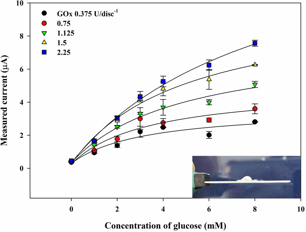 Figure 4 Measured current of the chronoamperometric (CA) curves (-0.155 V vs. Ag/AgCl) as a function of glucose concentration (Cg) of the PBS samples (20 μL) with the GOx paper disc on electrode prepared at different GOx concentration (CGOx); inset is the photographic image of the electrode with water droplet on the disc at CGOx > 2.25 U. |