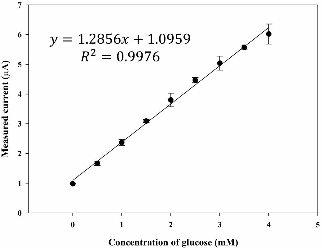 민감성, 선택성, 안정성 특성 평가. 앞서 언급한 최적의 전위 조건(-0.155 V vs. Ag/AgCl) 및 GOx 충전량(2.25 U disc-1)으로 글루코스 바이오센서의 검량선을 Figure 5와 같이 얻었다. 글루코스 바이오센서의 검량선은 0-4 mM의 범위에서 선형 방정식 y=1.2856x+1.0959로 나타났으며, 여기서 y는 μA 단위의 전류, x는 mM 단위의 글루코스 농도를 나타낸다. R2 값은 0.998로 나타났다. 또, 글루코스 1 mM 농도에서의 감소전류 표준편차는 2.02%(n=5)로 재현성이 양호했으며, IUPAC 기준에 기초하여 계산한 검출한계(LOD)는 0.01 mM이었다.