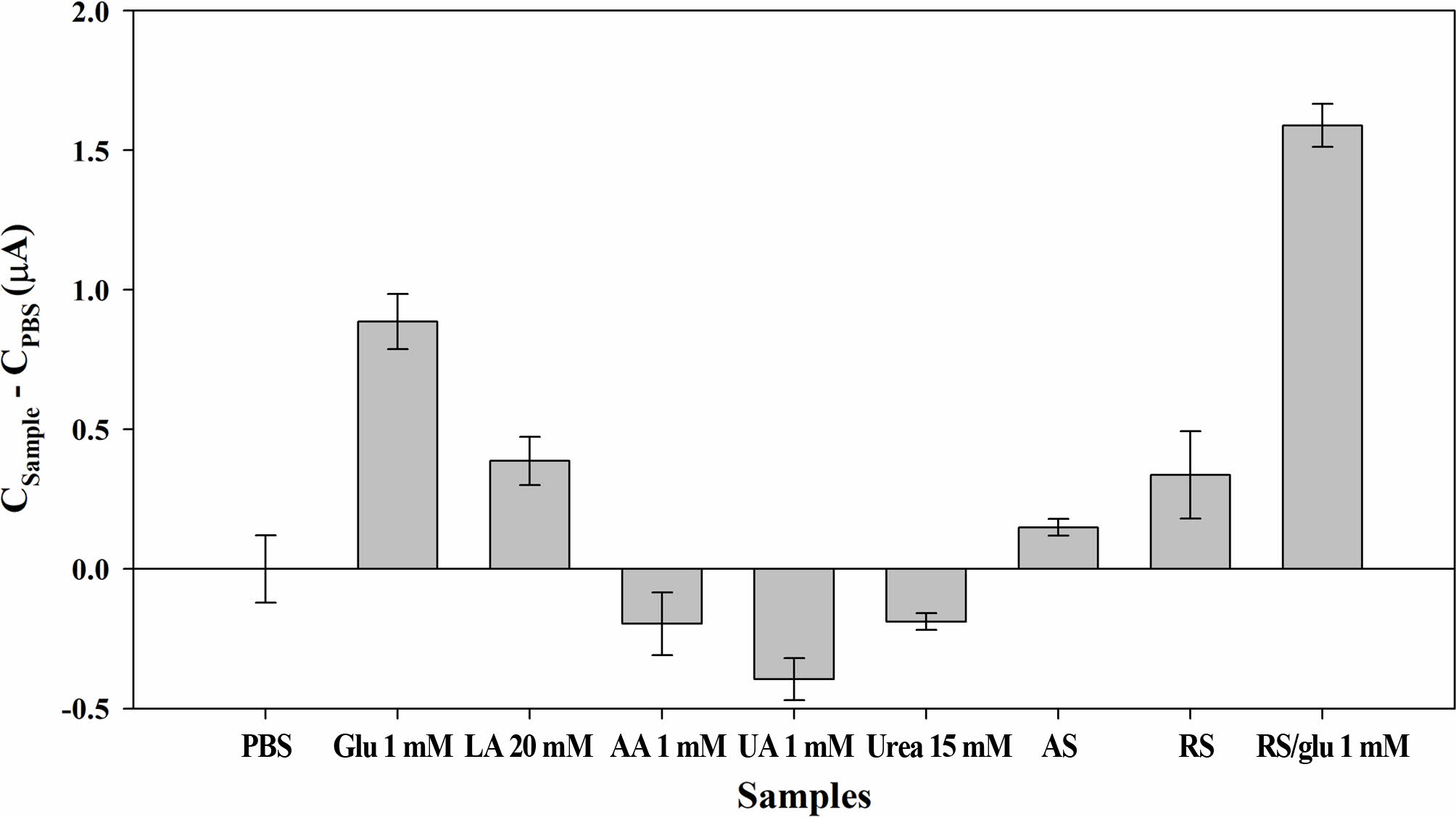 바이오센서에 있어서 CA방식으로 분석할 때 다른 화학물질에 의해 발생하는 전기적 간섭은 가장 큰 문제로 작용할 수 있다. 땀에 존재하는 다양한 불순물이 바이오센서의 반응에 영향을 미칠 수 있는지 각 불순물별 영향을 조사했다. 땀의 주성분인 LA(20 mM), AA(1 mM), UA(1 mM), Urea (15 mM)를 PBS에 녹여 각 감소전류를 Figure 6과 같이 측정하였다. 이 때 적용한 농도는 실제 땀에 들어 있는 양에 비해 높은 수준으로 준비하였다. 또한 채집된 실제 땀과 인공 땀을 측정하여 서로 비교하였다. LA(20 mM), AA(1 mM), UA(1 mM), Urea(15 mM), 글루코스 PBS 용액의 측정한 전류는 PBS만을 이용한 경우를 베이스로 하여 증가분으로 표시하였다. 글루코스 용액(Cg=1 mM)과 비교하면 AA, UA, Urea 용액은 감소 전류의 증가는 거의 없고 실제 PBS 용액보다 낮은 감소 전류를 나타났다. LA만이 감소전류가 0.4 μA 증가하는 것을 보이고 있다. 인공 땀에서도 미약하게 증가하며, 이는 LA의 영향으로 볼 수 있다. 글루코스 1 mM를 포함한 인공 땀의 감소전류는 1.5 μA의 높은 신호를 보여 글루코스에 대한 선택성이 매우 높음을 알 수 있다. 실제 사람의 땀을 검량선에서 측정한 결과 약 0.4 mM의 글루코스가 검출되었으며, 여기에 1 mM의 글루코스를 추가하여 측정했을 때 1.4 mM 수준으로 나타났다. 이는 실제 땀에서도 다른 불순물의 영향을 크게 받지 않으며, 충분히 실제 땀에도 적용하여 사용이 가능하다는 것이다.