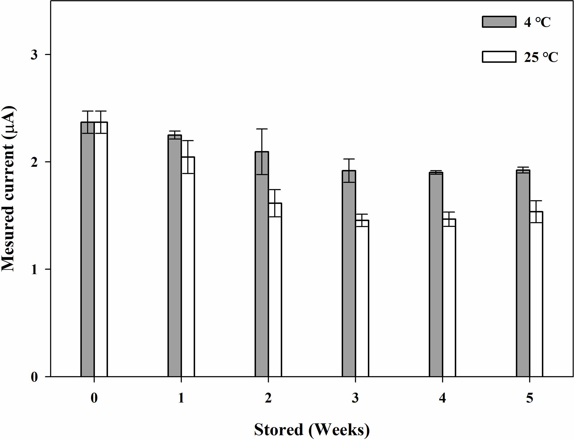 바이오센서는 GOx 종이 디스크의 상태가 가장 중요하게 작용한다. 따라서, 저장 안정성을 조사하기 위해 GOx 디스크를 4 °C와 상온에 보관하며 일정 기간마다 감소 전류를 측정하였다. 저장 시간에 따른 종이 기반 글루코스 바이오센서의 감소 전류의 신호는 Figure 7과 같다. GOx 종이디스크의 글루코스 용액(Cg=1 mM)에 대한 감소전류는 4 °C에 보관하여 35일 동안 시험한 후에도 초기 전류 값의 80%를 유지했다. 상온에서 보관된 경우 14일 경과 후 급격히 감소하여 35일 동안 초기 전류 값의 60%까지 감소했다. 따라서 본 연구에서 제조한 GOx 종이 디스크 바이오센서는 매우 안정하여 장기간 사용할 수 있었다.