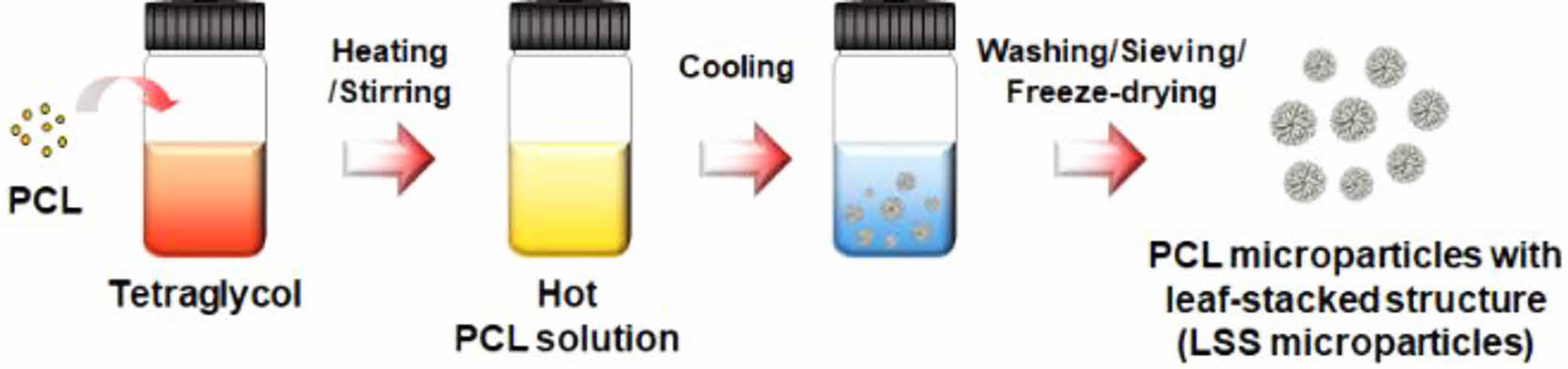 낙엽적층구조를 가지는 미세입자의 제조 및 분석. 전체가 낙엽적층구조를 가지는 PCL 미세입자(PCL LSS)는 본 연구팀의 선행 연구로 개발된 가열-냉각법(heating-cooling technique)으로 간단하게 제조하였다.32 구입한 PCL 분말을 테트라글리콜에 15 wt%가 되도록 정량하여 넣은 후, 90 oC에서 15분 동안 가열하여 용액 상태로 제조하였다. 뜨거운 상태의 고분자 용액을 4 oC에서 1시간 동안 냉각시켜 고분자의 침전을 유도하였으며(투명한 고분자 용액이 불투명하게 변함), 여기에 증류수를 과량 첨가하고 세척/체질/동결건조하여 25-53 μm 크기의 낙엽적층구조를 가지는 미세입자를 제조하였다(Figure 1). 제조된 낙엽적층구조 미세입자의 형태는 단국대학교 바이오의료공학 핵심연구지원센터의 전계방출형 주사전자현미경(FE-SEM; model S-4300, Hitachi, 일본)을 이용하여 관찰하였다. 세포 실험을 위한 낙엽적층구조 미세입자는 산화 에틸렌 멸균 장치(ethylene oxide gas sterilizer)를 이용하여 멸균 후 사용하였다.