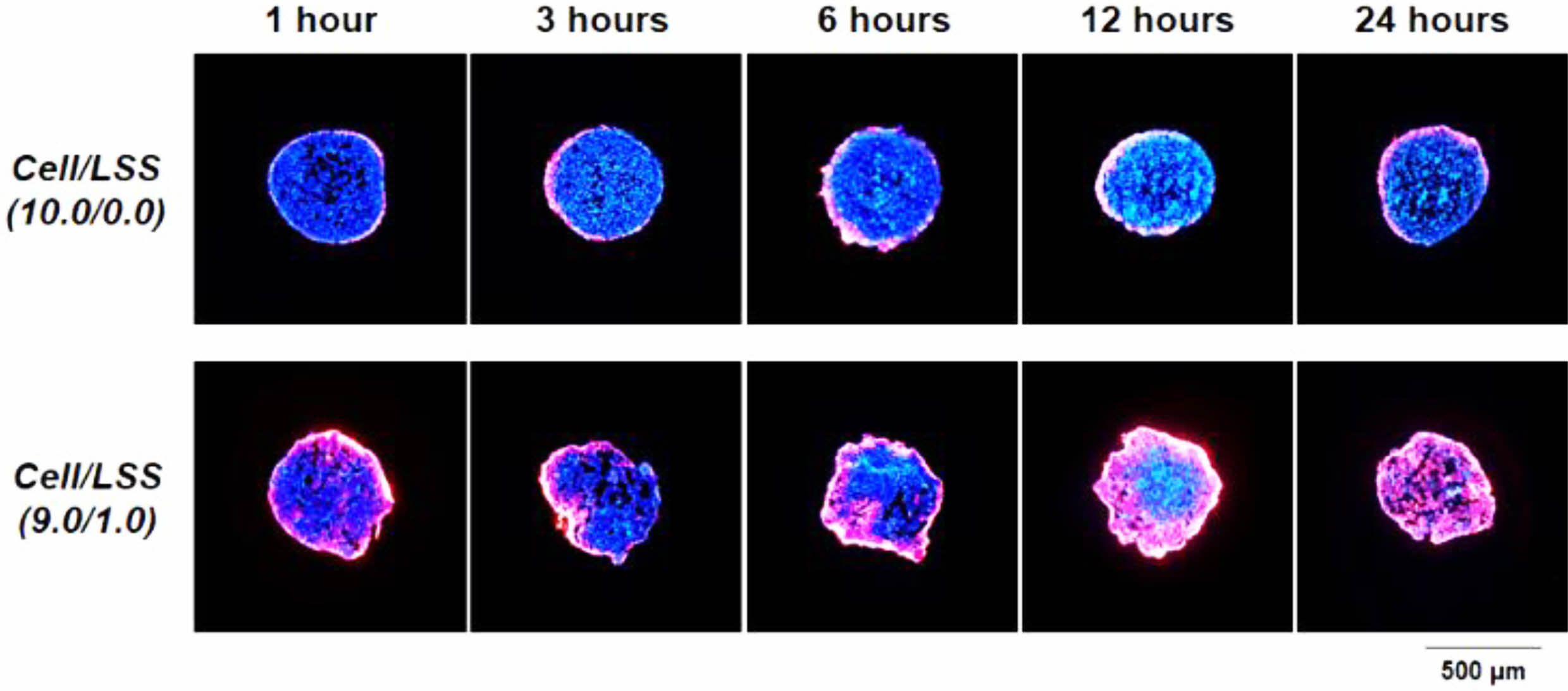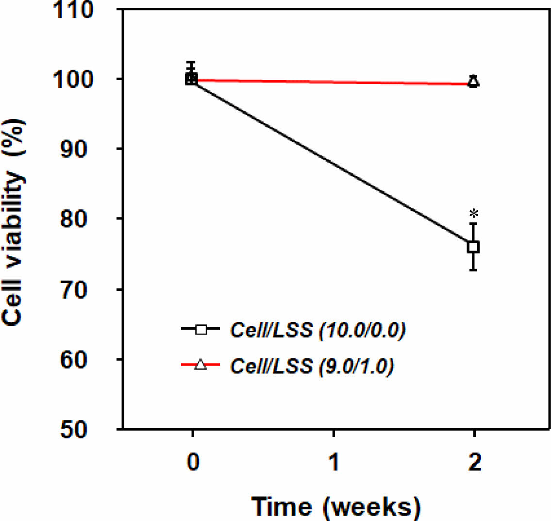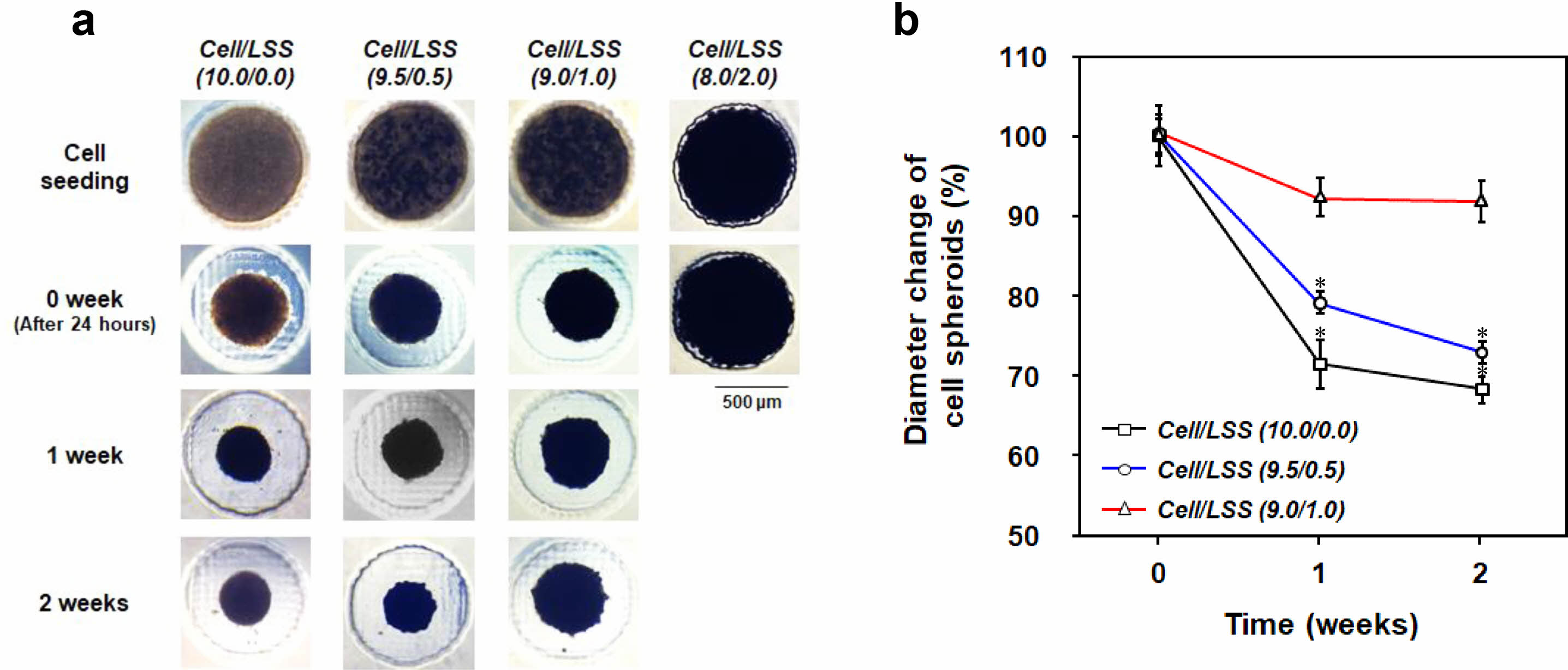 Figure 4 Characterization of cell spheroids [Cell/LSS (10.0/0.0), Cell/LSS (9.5/0.5), Cell/LSS (9.0/1.0), and Cell/LSS (8.0/2.0)]: (a) Representative images of cell spheroids and (b) quantitative analysis of temporal variation in the size of cell spheroids [n=3 (1=30 spheroid s); *p<0.05, compared to the result of 0 week]. |