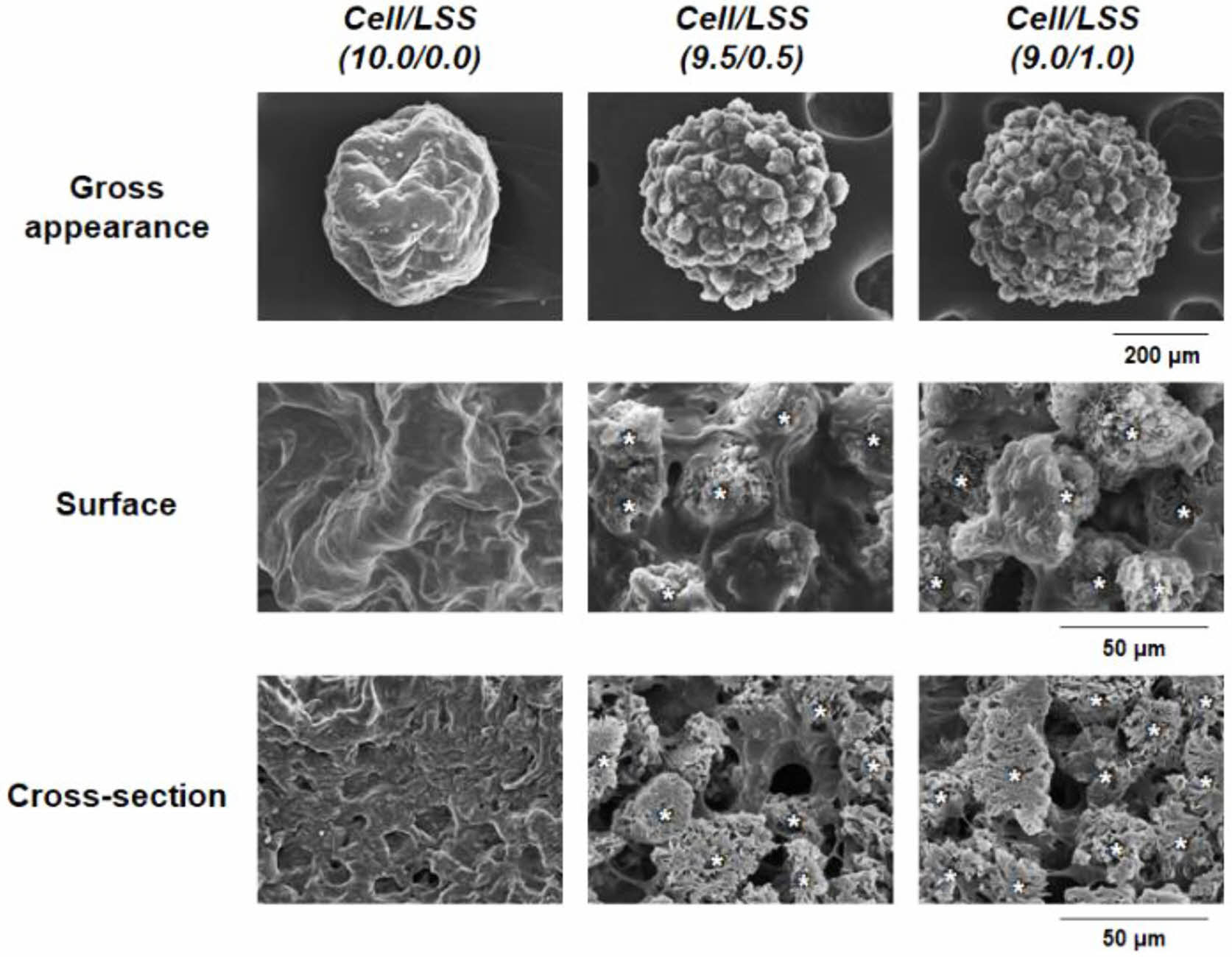 Figure 5 Gross appearance, surface and cross-sectional images of each cell spheroid at 24 hours of cell culture (*, LSS microparticles). |