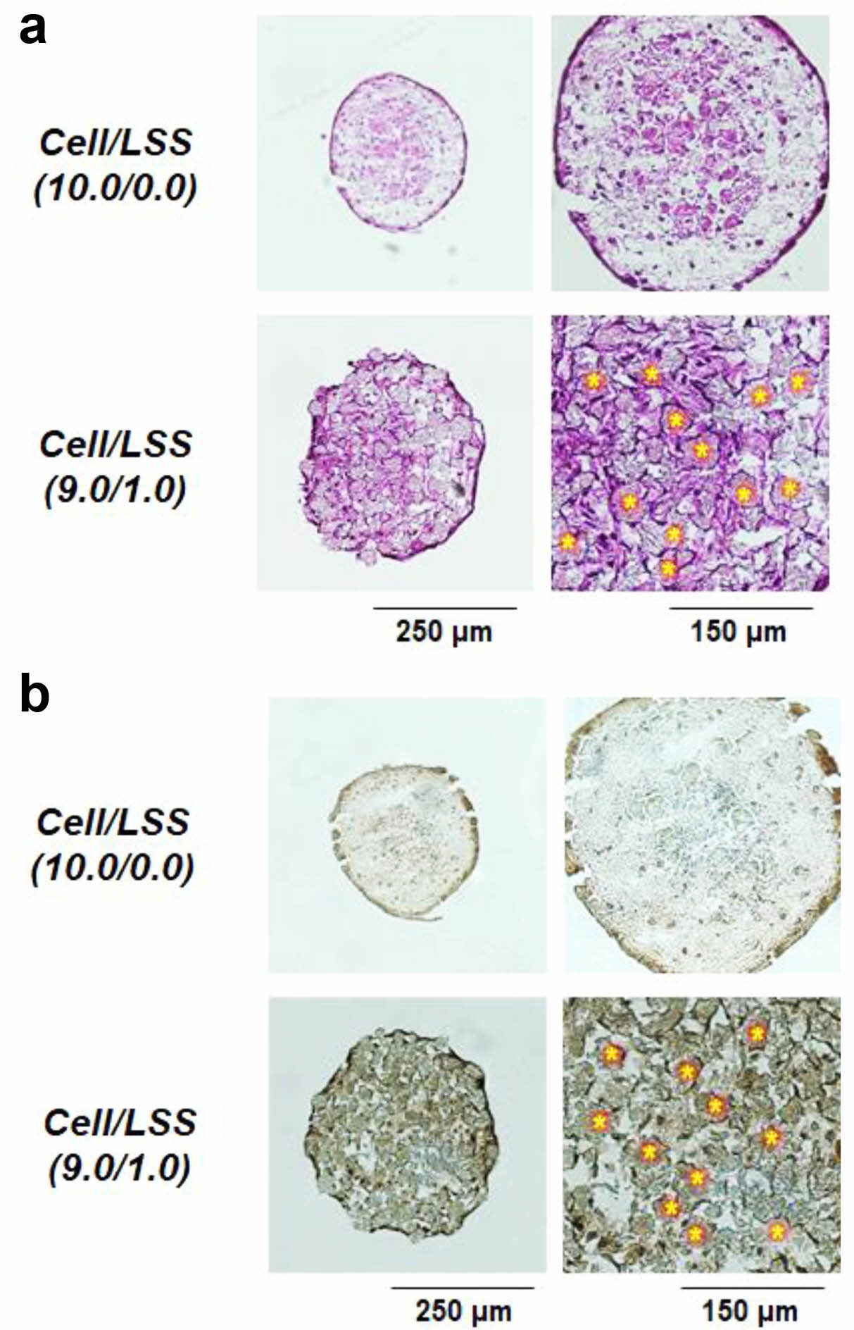 Figure 7 (a) H&E staining; (b) Ki-67, staining of cell spheroids [Cell/LSS (10.0/0.0) and Cell/LSS (9.0/1.0)] at 2 weeks of cell culture (*, LSS microparticles). |
