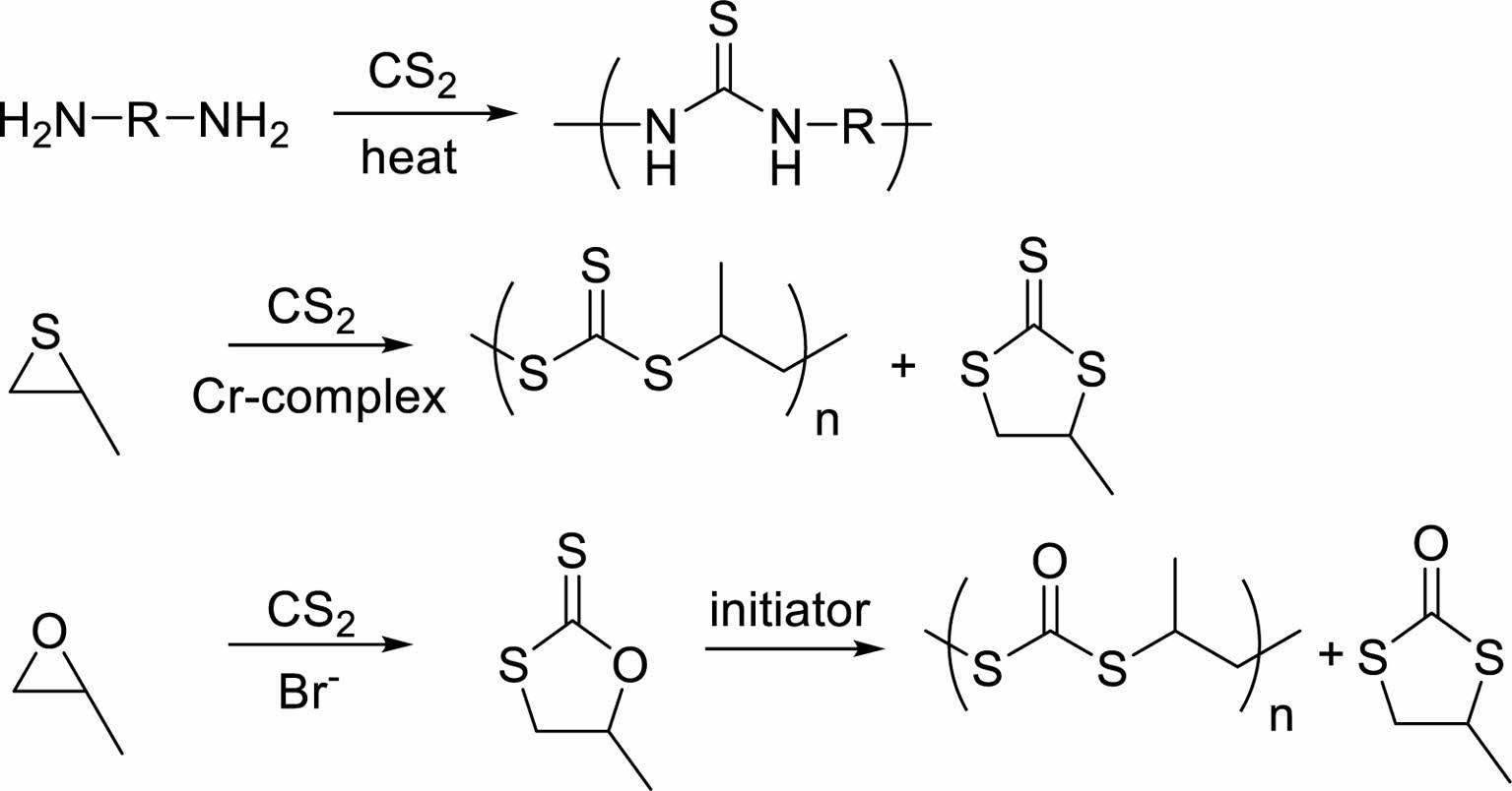 황을 포함하는 고분자는 전기적 절연성과 내열성 및 기계적 성질이 우수하고 특히, 광투명성과 높은 굴절율로 광학 재료로 꾸준히 사용되고 있다.1,2 금속에 대한 높은 점착성과 금속이온과의 강한 화학적 결합 특성은 소재의 응용성을 넓혔다.3 탄소에 결합된 황은 S, Sn, SO, SO2, SO3, SO4 등의 다양한 결합상태를 유지하고, 원자 상태로 결합된 작용기로 티오에스테르, 티오카보네이트, 티오아마이드, 티오우레탄 등과 같은 형태로 고분자에 도입된 구조가 일반적이다.4 타이어 제조로부터 안경렌즈, 이온 분리막 및 이온 전도성 재료, 생체적합 재료로 꾸준한 연구가 되고 있다.5 이들 황화물 고분자는 이중결합에 대한 클릭반응과6 에피설파이더의 개환반응,7 포스겐과 같은 카보닐 결합체 사용과 카보닐 치환반응 등으로8 합성될 수 있다. 천연가스와 황의 고열반응에 의해 대량 제조되는 CS2를 활용한 황화물 고분자 합성에 대한 흥미로운 연구가 많이 발표되고 있다. 에폭시 또는 에피설파이와 CS2의 공중합고분자 형성반응은 정교한 구조의 크롬 촉매에 의해 진행되고 고굴절 광특성을 갖는 폴리디티오카보네이트(poly(dithiocarbonate))와 폴리트리티오카보네이트(poly(trithiocarbonate))를 형성한다.7 디아민과 CS2의 중합반응으로 합성된 티오우레아 고분자는 수은과 같은 중금속 이온의 흡수 소재로 개발되었다(Figure 1).9,10