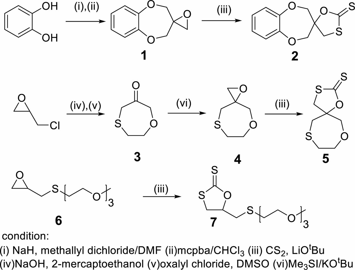 5-Cyclic Dithiocarbonate 단분자 합성. 개환반응에 참여할 수 있는 인접한 작용기가 도입된 5-각환의 디티오카보네이트 3종을 설정하고 Figure 2에 정리된 방법으로 합성하였다. 2개의 산소원자가 동등한 위치에 결합된 스피로 에폭시 1은 오르토-카테콜과 methallyl dichloride로부터 고리화 반응과 이중결합의 산화반응으로 합성하였다. 에폭시기에 대한 CS2의 고리화 첨가반응은 LiBr나 LiOtBu 촉매하에서 잘 진행되었고 단분자구조인 2가 높은 수율로 생성되었다.13 Epichlorohydrine과 2-mercaptoethanol의 고리화 반응은 묽은 농도의 NaOH 수용액에서 진행되었다.14 Oxallyl chloride와 DMSO에 의한 선택적 산화반응으로, 고리화 반응 생성물이 갖는 2차 알코올을 산화시켜 케톤 3을 얻었다. Sulfonium ylide를 케톤과 반응시켜 에폭시 물질 4를 합성하였고 CS2와 고리화 첨가 반응을 통해 O, S가 동등한 위치에 결합된 단분자 5를 얻었다. Triethylene oxide가 황에 의해 결합된 곁사슬형 에폭시 6의 CS2 첨가반응을 통해 단분자 7이 합성하였다.