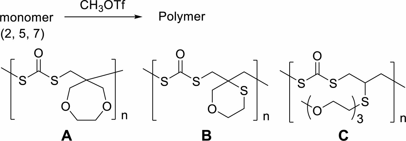 양이온 개환 고분자 반응. 고리형 디티오카보네이트는 산에 의해 고분자 반응이 잘 진행되는 물질이다. O-C=S가 S-C=O로 바뀌는 결합 안정화 효과와 개환에 따른 자유에너지의 이점이 이 반응의 추진력이다. 그러나, 형성된 고분자 폴리디티오카보네이트는 열적 안정성이 떨어지고 개환반응의 경쟁반응인 말단 사슬 끊김(back-biting) 반응으로 고분자 수율과 분자량 증가에 한계가 있었다. 또한, 단분자의 단순한 O/S 교환 반응을 통한 이성질화 현상이 경쟁반응으로 잘 진행되기 때문에 고분자 생성의 수율이 떨어지는 주 원인으로 지적되었다. 최근 개환 고분자반응에서 중간체를 안정시켜주는 인접 작용기 효과를 통해 고분자 생성 효율을 증가시킬 수 있다는 것이 알려졌다.12 양이온 개환반응 조건에서 반응생성 중간체로 양이온 구조가 생성됨으로써 인접한 황 원자의 참여는 안정한 episulfonium cation이 형성할 수 있고 이로부터 경쟁 반응을 억제할 수 있었다.