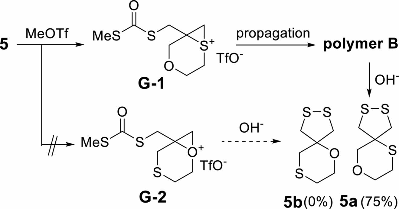 유사하게 산소가 인접할 경우, oxonium cation 형성을 통한 고분자 형성의 가능성을 조사하였다. 두 개의 산소가 고리형 구조로 인접한 단분자 2를 사용하여 고분자 반응을 진행하였다. 반응 개시제로 중성의 methyl triflate를 사용한 결과 Figure 3에 나타난 고분자 A가 얻어졌다. 형성된 고분자의 구조분석을 통해 두 개의 산소가 결합된 7-각환 구조는 단분자와 동일하게 유지되었다. 고분자 형성 과정에서 인접 산소의 영향에 대한 증거를 얻지 못하였다. 황과 산소원자가 도입된 단분자 5를 사용하여 반응시켰을 때 생성된 고분자의 구조는 B와 같은 구조로 밝혀졌다. 단분자의 7-각환이 6-각환 구조로 변화된 고리축소 현상이 관찰되었다. 이를 설명하기 위해 Figure 4에 반응 메카니즘을 제안하였다. Episulfonium과 oxonium 이온 중간체로 각각 G-1과 G-2의 형성은 개환반응에서 황과 산소의 안정화 기여를 설명할 수 있다. 결과적으로, 황에 의한 안정화가 진행되는 방향으로 반응이 일어났음을 알 수 있다. 고분자의 구조를 명확히 결정하기 위해 염기성 조건에서 고분자 분해반응을 진행하였다. 생성물 구조로 5a와 5b가 가능하지만 실제 5b는 형성되지 않았고 5a만 분리되었기에 고분자의 구조를 증명할 수 있었다. 분리된 5a의 구조는 1H NMR과 13C NMR에서 뚜렷하게 확인될 수 있었다. 유사하게 단분자 7의 반응은 episulfonium cation 형성을 통해 고분자 C를 생성하였다.