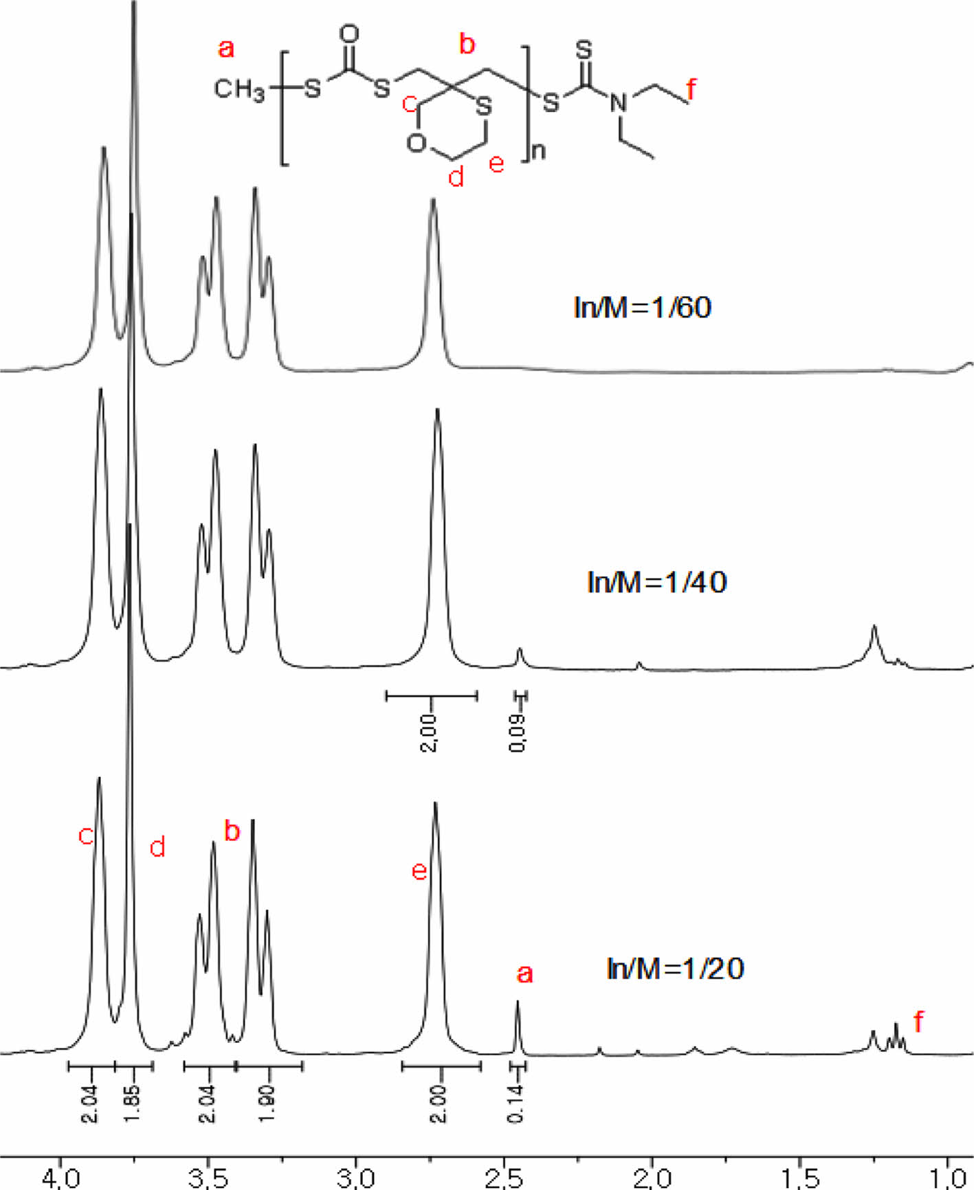 개시제의 사용량에 따라 합성된 고분자 B의 1H NMR 스펙트럼을 Figure 5에 비교하였다. 2.46 ppm의 수소는 반응 개시제(MeOTf)로부터 유래된 CH3가 결합된 고분자 말단의 CH3 이며, 2.75 ppm은 고리구조의 메틸렌 수소(CH2-S)의 특성 흡수 띠로 해석되고, 이 두 수소의 적분값을 비교함으로써 고분자 사슬의 평균 길이를 계산할 수 있었다. 이를 Table 1에 표시하였고, 측정된 분자량과 잘 일치하였다. 고분자 합성에서 단분자가 모두 소모된 후 사슬말단은 여전히 반응성을 갖고 있어 이를 작용기로 변화시키는 과정을 진행하였다. Sodium diethyl dithiocarbamate를 반응시킨 결과 사슬말단에 diethyl dithiocarbamate가 결합된 고분자를 얻을 수 있었다. Figure 5에서 1.20 ppm의 triplet은 carbamate의 결합을 의미하고, 적분값을 통해 고분자에 약 80%의 carbamate 치환효율이 나타났다.