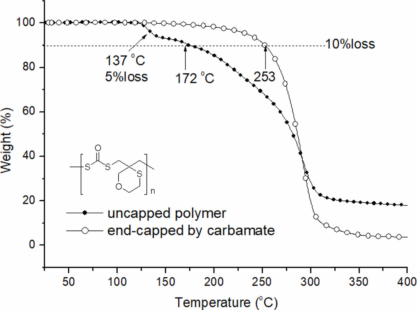 폴리디티오카보네이트의 열안정성을 TGA 분석을 통해 관찰하였고 Figure 6에 도시하였다. 고분자 B는 130 oC에서 분해가 시작되는 열적 특성이 나타났다. Carbamate로 말단 치환된 고분자의 경우 안정성이 증가하였고 200 oC 이상까지 분해가 진행되지 않고 253 oC에서 10% 분해가 진행되는 현상을 보였다.