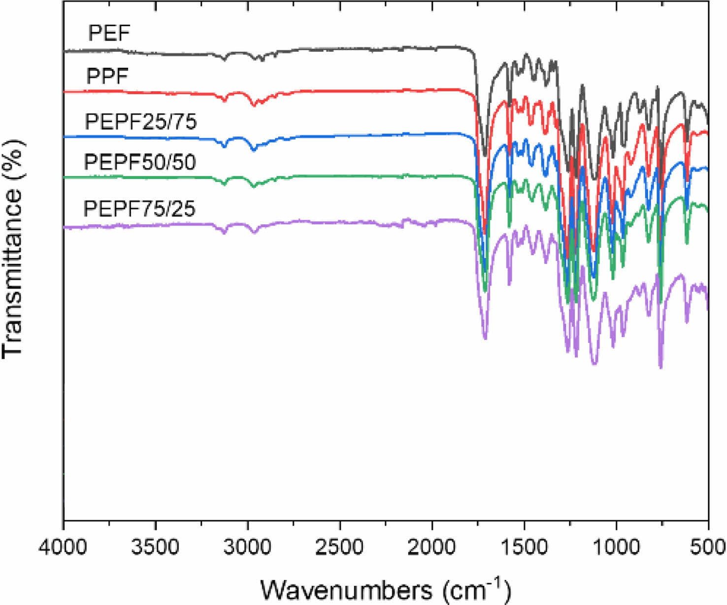 Figure 2 FT-IR spectra of PEF, PPF and PEPF copolymers. |