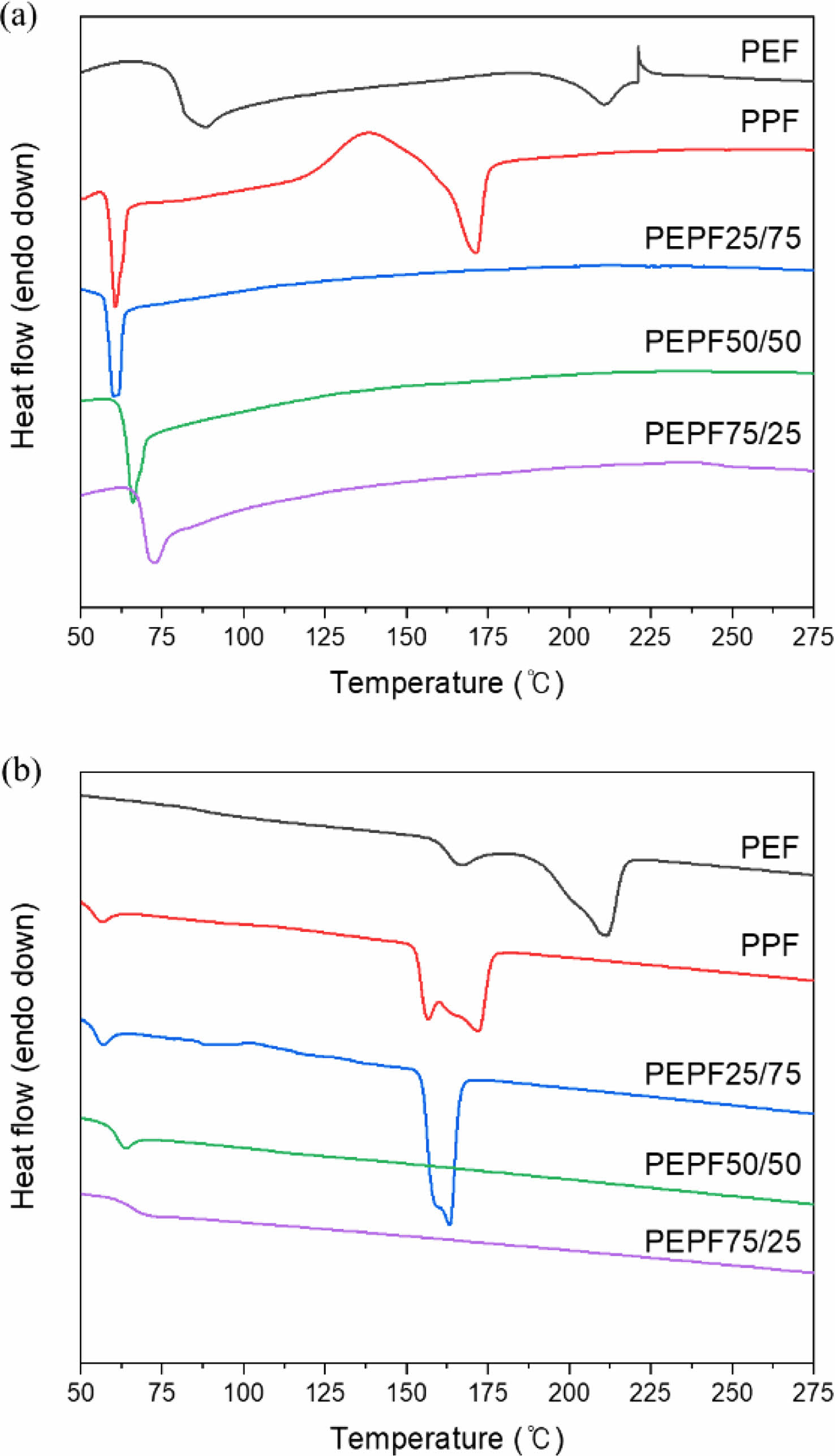 Figure 5 DSC curves of (a) as-prepared; (b) thermal treated PEF, PPF and PEPF copolymers. |