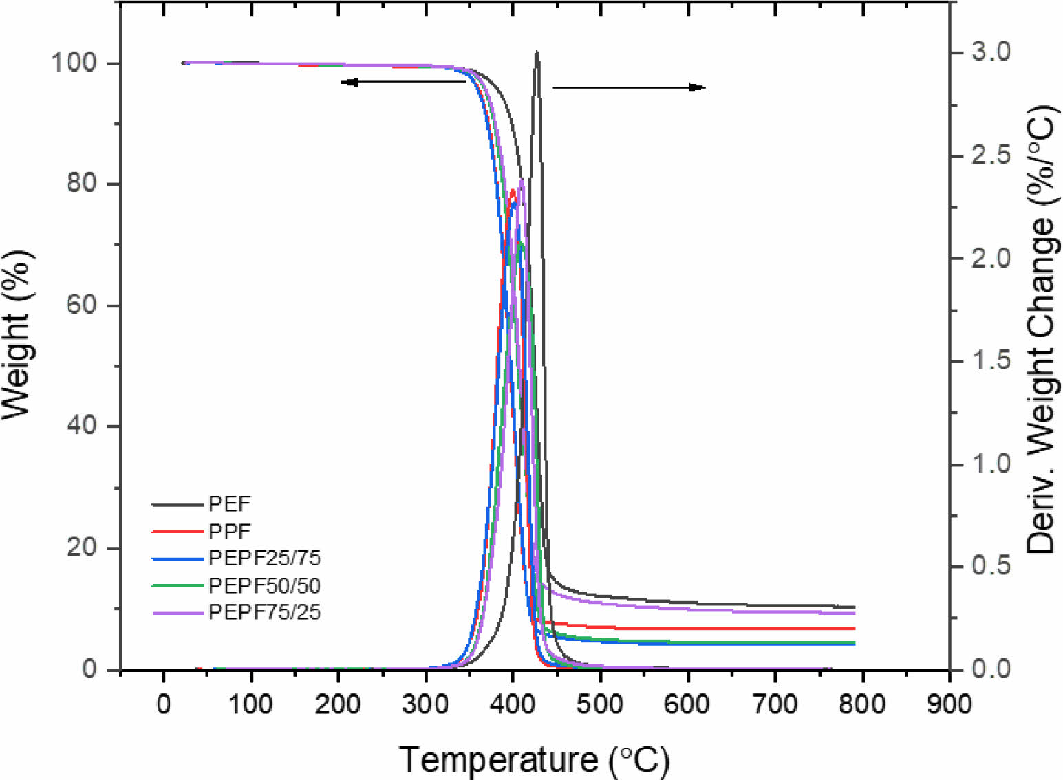 Figure 6 TGA thermograms of PEF, PPF and PEPF copolymers. |