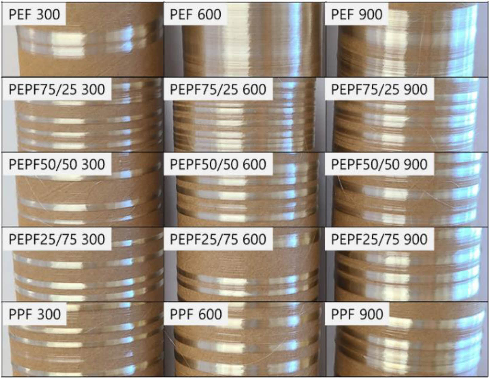 합성한 copolyester는 간이 방사기를 사용하여 300, 600, 900 m/min의 세가지 winding speed 조건에서 용융방사하였다. PEF, PPF, PEPF25/75는 230, 190, 170 oC에서 각각 방사하였으며, PEPF50/50과 PEPF75/25는 Tm이 나타나지 않아 임의의 온도(195 oC)에서 방사하였다. 각 copolyester에 최적화된 방사조건이 아니기 때문에 섬유의 종류에 따른 경향이 명확하게 나타나지 않았다. Figure 7에서 보이는 것처럼 방사된 섬유는 모두 옅은 노란빛을 띄었다. 이는 중합된 copolyester의 색에서 기인한 것이며, 일반적으로 원료의 순도와 중합과정에서 발생하는 부반응에 의해 나타난다고 알려져 있다.20 방사한 섬유는 추가적인 연신이나 열처리를 거치지 않고 방사된 그대로 인장시험을 하였다.