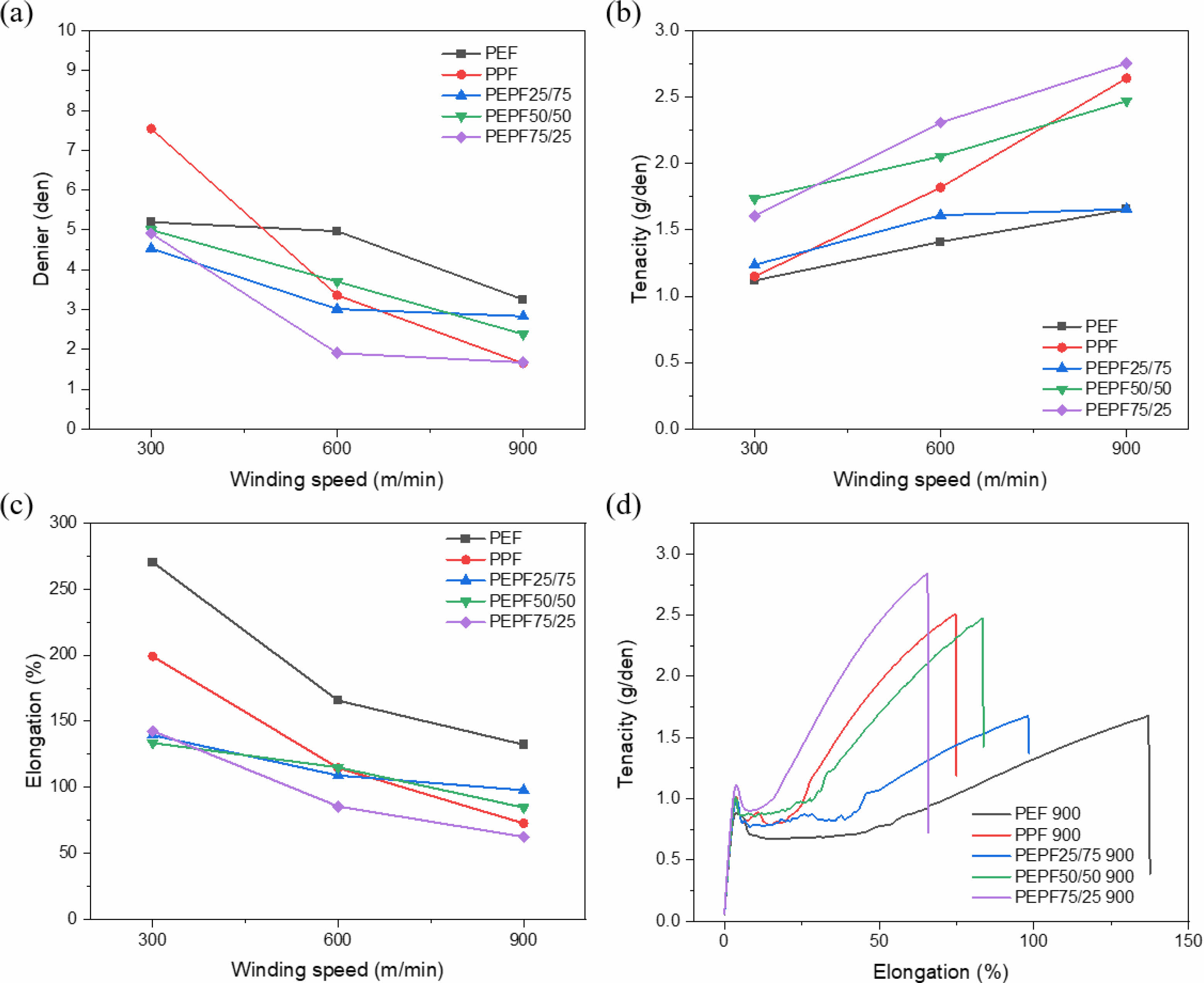 Figure 8 (a) Denier; (b) tenacity; (c) elongation of copolyester fibers according to winding speed; (d) tenacity curve of copolyester fibers at winding speed of 900 m/min. |