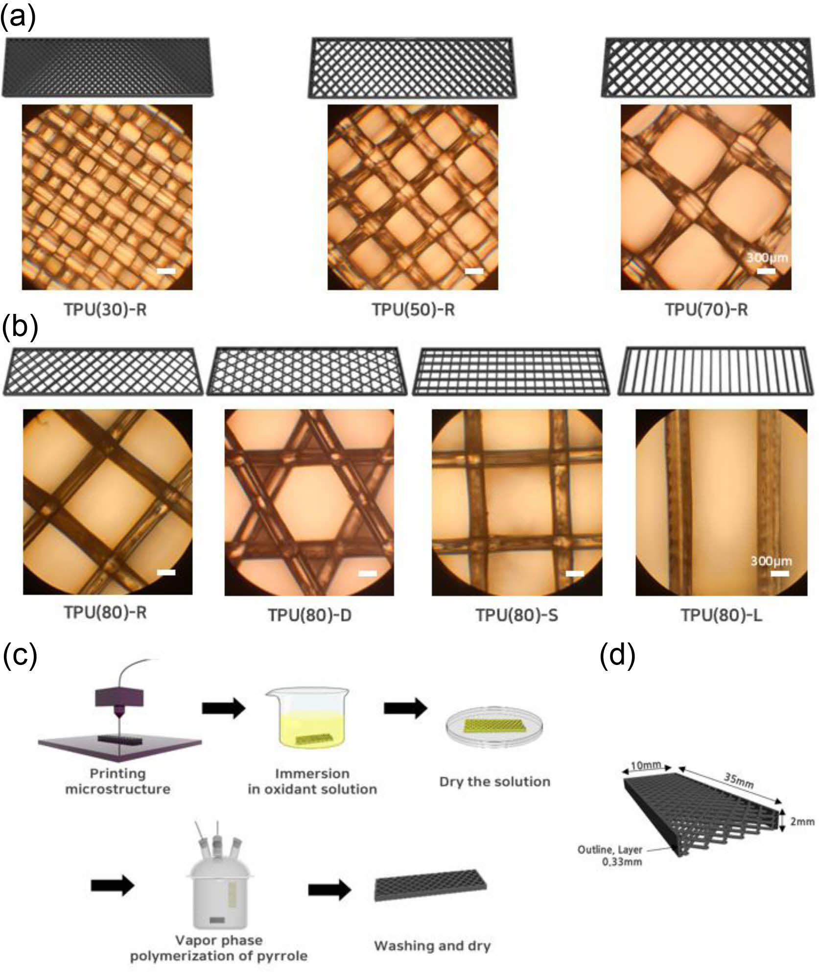 Figure 1 (a) Porosity variations of TPU-PPy-R composites; (b) pore structure changes of various TPU-PPy composites; (c) fabrication schematics of electrically modified 3D-printed soft TPU composites; (d) details dimensions of 3D-printed samples. |