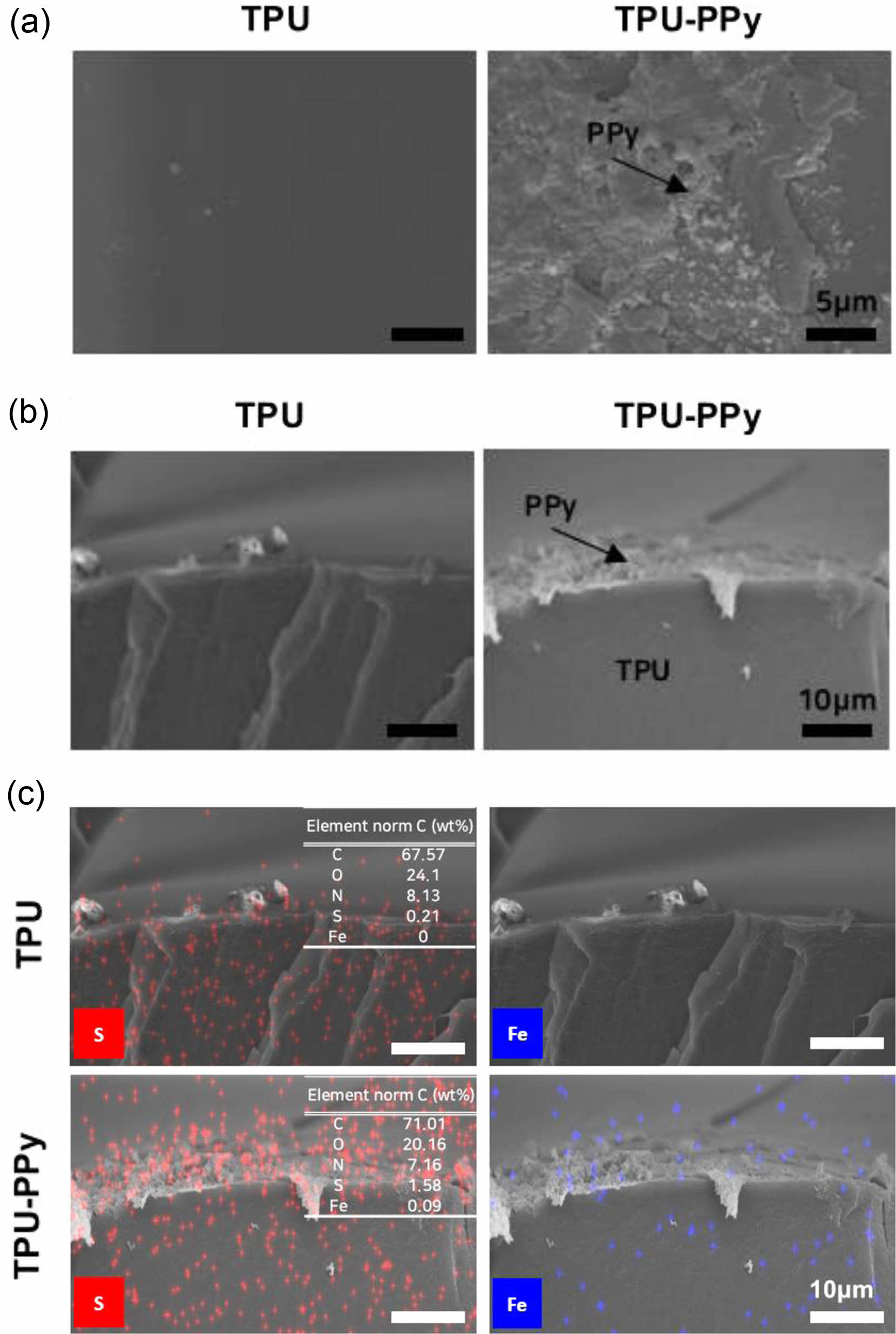 Figure 2 Morphology and chemical characterization of 3D-printed soft TPU composites (TPU(80)-PPy-R). (a-b) SEM images of TPU and TPU-PPy, (a) surface; (b) tilted cross-section; (c) EDS elemental mapping. |