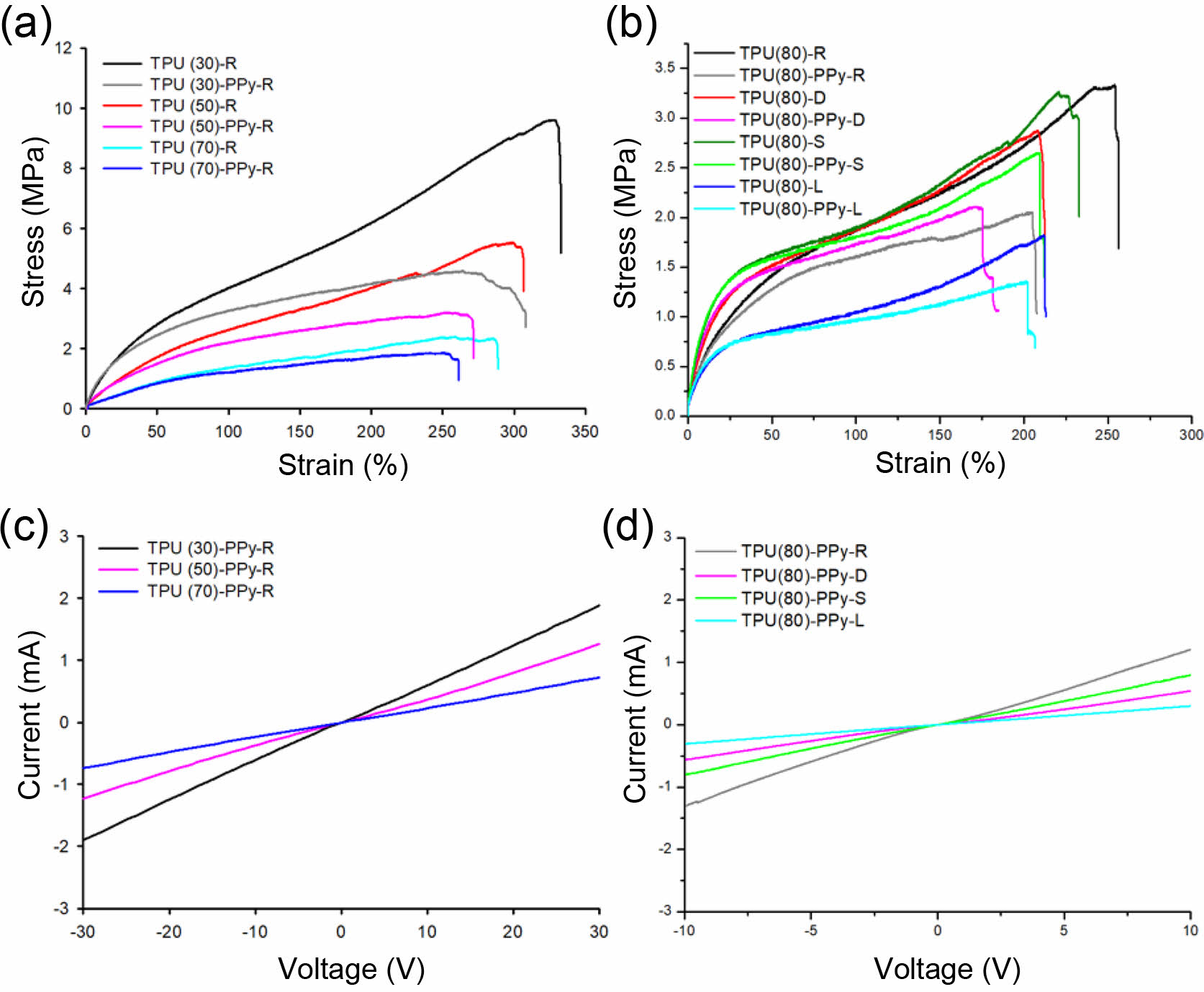 Figure 3 Mechanical and electrical properties of various TPU, TPU-PPy composites. (a) stress-strain curve for TPU-PPy-R composites with different porosities; (b) stress-strain curve for TPU(80)- PPy composites with different pore structures; (c) I-V for samples with different porosities; (d) I-V for samples with different pore structures. |