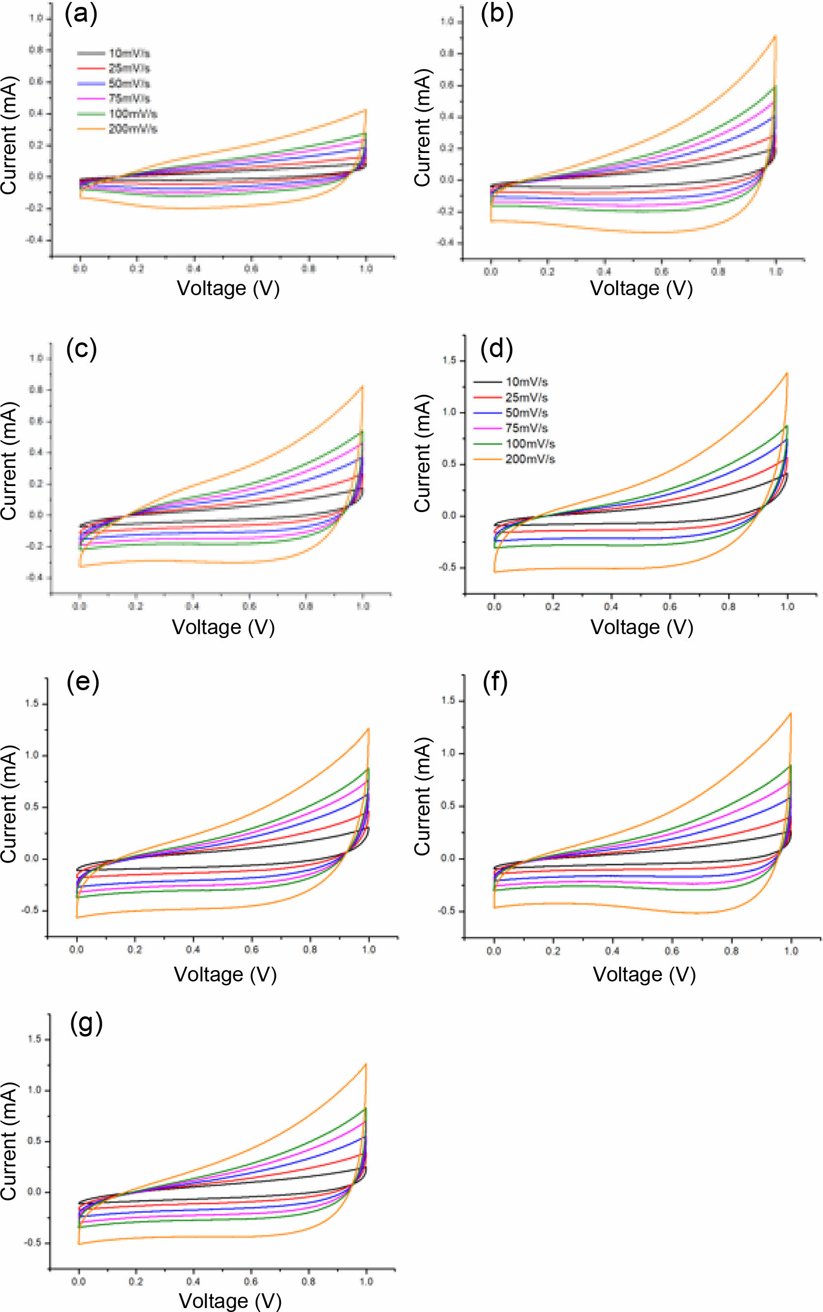 Figure 4 Cyclic voltamograms of various TPU-PPy composites. (ac) Porous composites with different porosities (a) TPU(30)-PPy-R; (b) TPU(50)-PPy-R; (c) TPU(70)-PPy-R, (d-g) Porous composites with different pore structure; (d) TPU(80)-PPy-R; (e) TPU(80)-PPyD; (f) TPU(80)-PPy-S; (g) TPU(80)-PPy-L. |