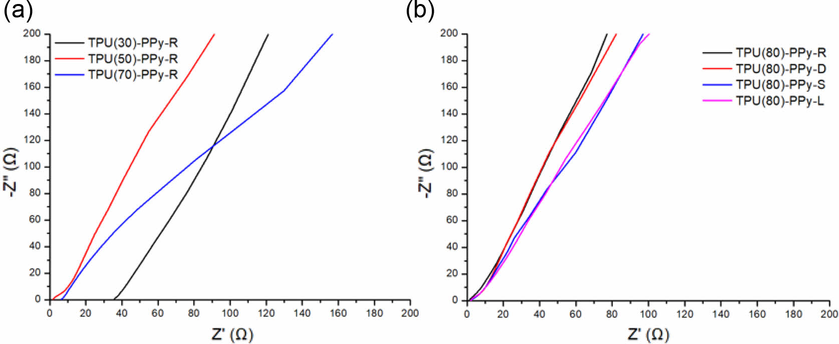 슈퍼커패시터의 전기화학적 성능을 분석하는 다른 방법은 electrochemical impedance spectroscopy(EIS)이다. EIS는 Nyquist plot으로 나타내며 X축절편이 재료의 표면저항을 나타내며 초기 반원은 전해질의 이온 저항을 나타낸다. 또한 초기 반원 이후의 곡선은 Warburg 곡선이라고 한다. Figure 5(a), (b)는 각 기공률과 기공구조가 다른 다공성 TPU-PPy 복합체들의 Nyquist plot을 보여준다. 재료의 저항을 나타내는 고주파 영역에서 모든 TPU-PPy 복합체는 Warburg 곡선이 1이상의 기울기를 가지는 semi-infinite warburg impedance 곡선을 나타내어 전도도 특성이 우수하였다. 또한 기공률이 낮을수록(TPU(30)-PPy-R), 기공구조가 R-type을 가지는 것이 Warburg 곡선의 기울기가 높아 좀 더 우수한 전도도를 보였다.