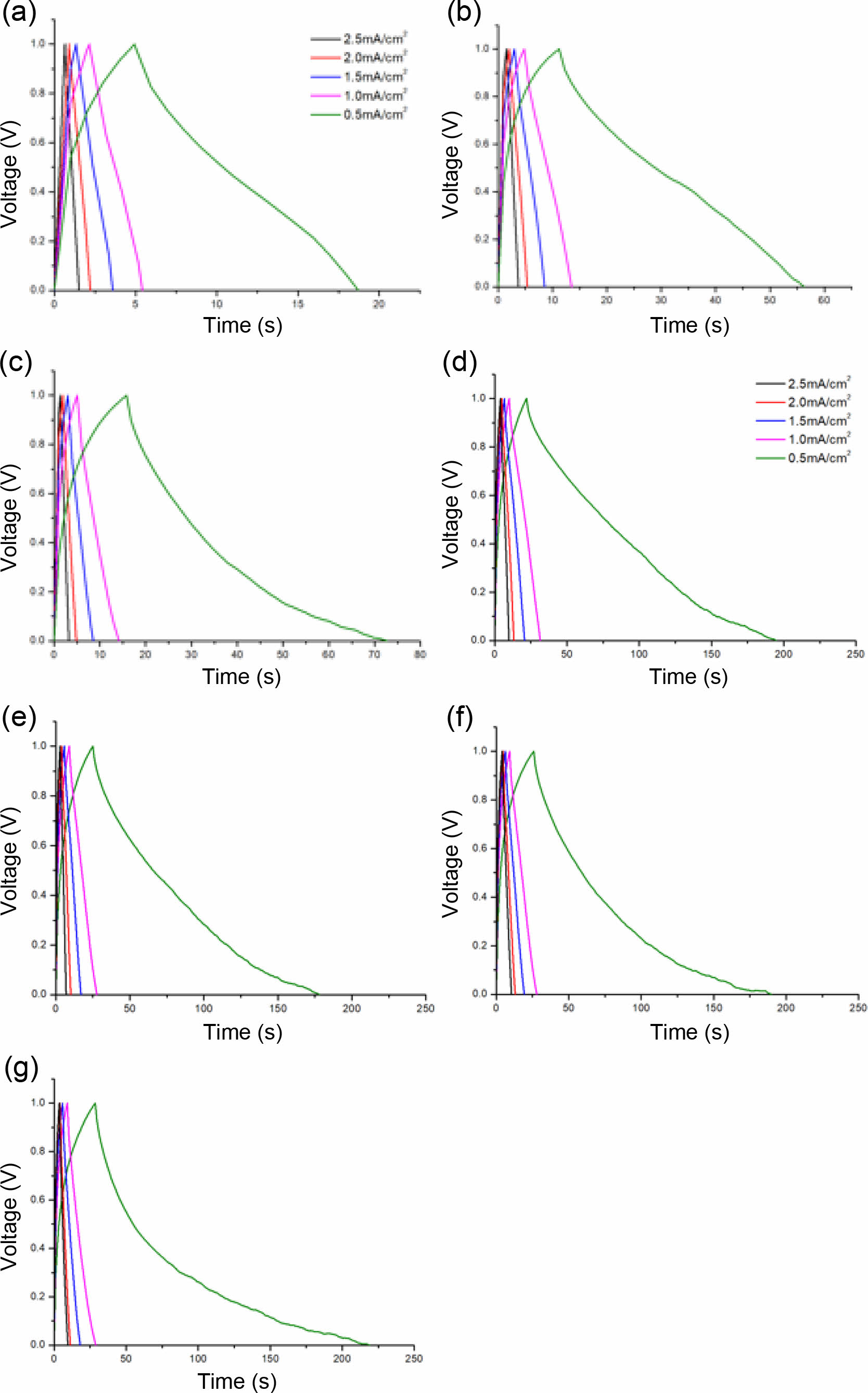 Figure 6 Galvanostatic charge-discharge profile of various TPUPPy composites. (a-c) Porous composites with different porosities (a) TPU(30)-PPy-R; (b) TPU(50)-PPy-R; (c) TPU(70)-PPy-R; (d-g) Porous composites with different pore structure; (d) TPU(80)-PPyr; (e) TPU(80)-PPy-D; (f) TPU(80)-PPy-S; (g) TPU(80)-PPy-L. |