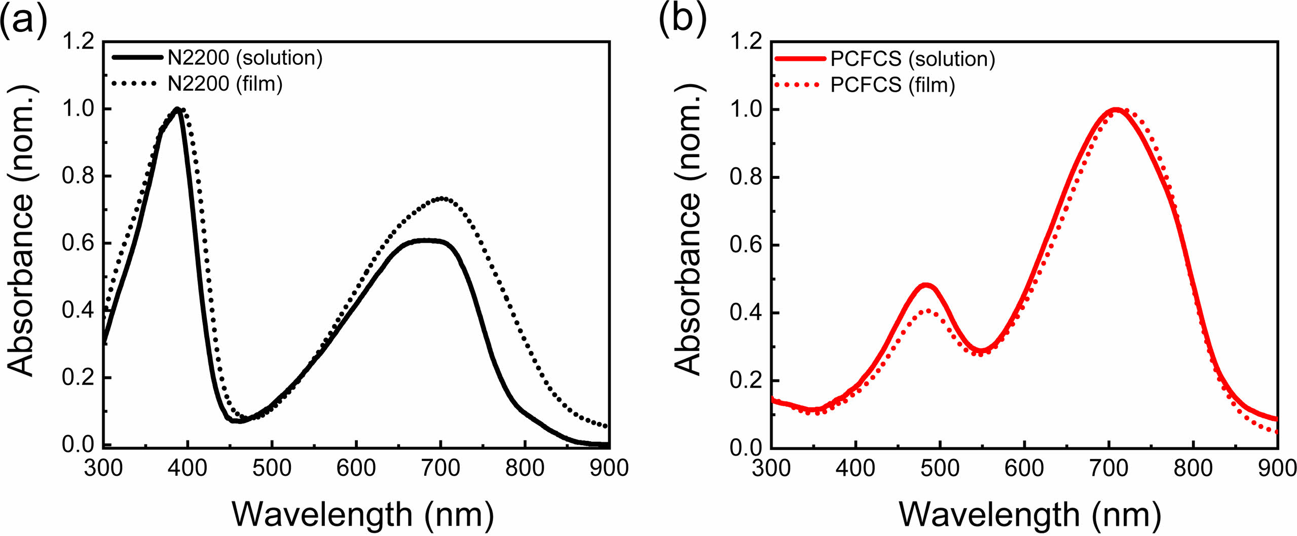 Figure 1 Optical properties of N2200 and PCFCS: UV-Vis spectrum of N2200 and PCFCS in (a) solution; (b) film, respectively. |