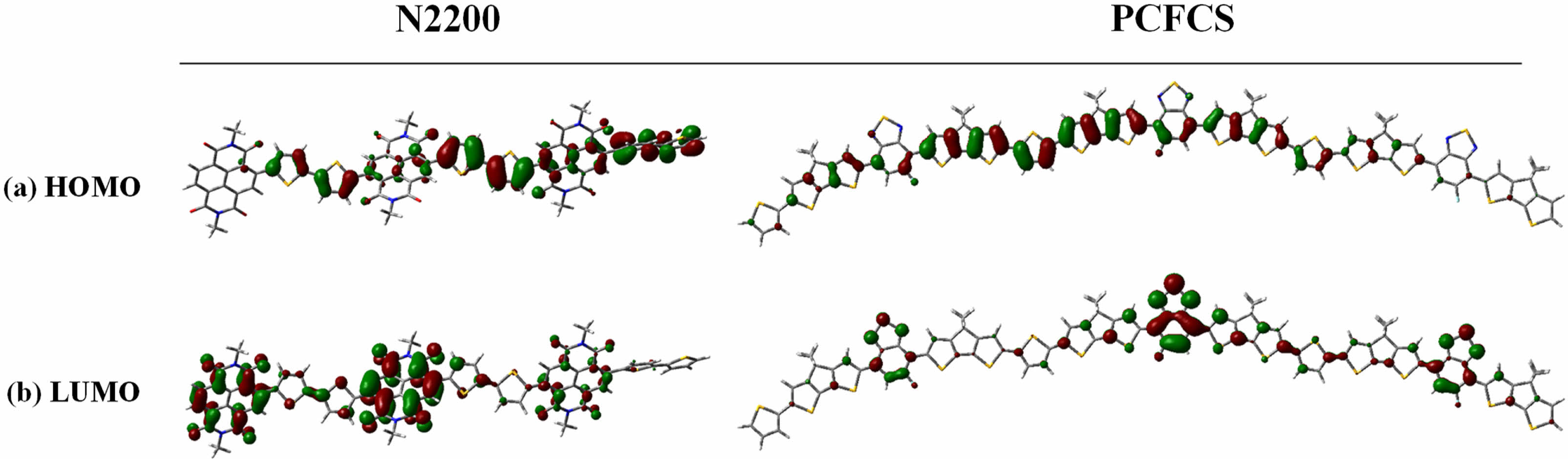 Figure 3 Calculated DFT-optimized geometries and charge–density isosurfaces for model trimer of N2200 and PCFCS; (a) HOMO and (b) LUMO levels |