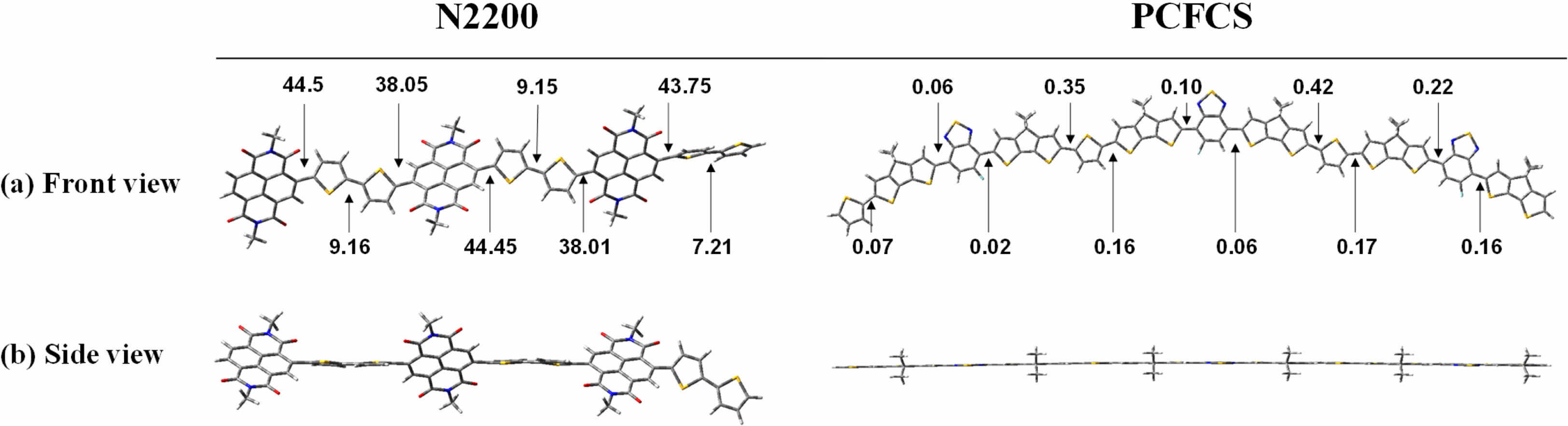 N2200과 PCFCS의 최적화된 구조에서의 비틀림 각도를 Figure 4에 나타내었다. N2200의 side view에서는 비틀림 각도가 38o 이상인 것을 확인할 수 있었고, PCFCS는 전자공여체와 전자수용체의 이면각이 거의 0o에 가까운 직선 형태인 것을 확인할 수 있었다(Figure 4(b)). PCFCS 의 편평한 구조는 전자공여체와 전자수용체 간의 F-S, H-F, H-N 비공유 상호작용과 π–π 궤도 간의 겹침에 의해서 나타난다.46-49 이러한 결과는 PCFCS가 조밀한 π–π stacking을 형성함으로써, 높은 전하이동도를 나타낼 것으로 예상된다.43