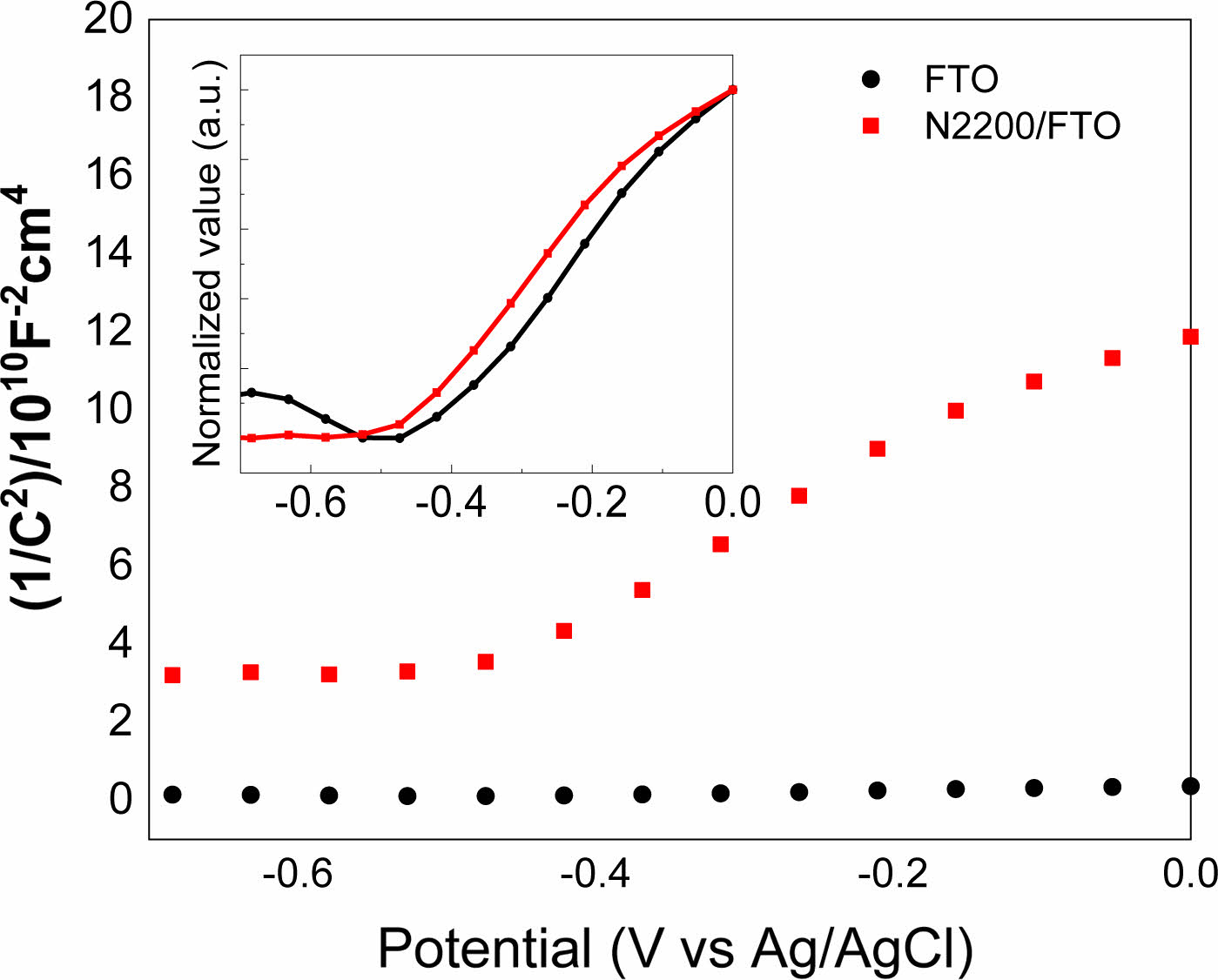 방정식에서 C 는 단위 면적당 커패시턴스(capacitance)를 나타내고, q는 기본전하, ε은 N2200(2.880) 및 FTO 유리 전극(2.133)에 대한 유전 상수,50 ε0는 진공 유전율, Nd는 전자수용체 밀도, V 는 적용 전위, VFB는 플랫 밴드 전위, k 는 볼츠만 상수, T는 온도를 나타낸다. 계산한 1/C2을 y축으로, x축을 potential로 설정한 Mott-Schottky 그래프에서 n-type 반도체는 양의 기울기를 나타내는 선형의 모양을 가진다. 그러므로 FTO 유리 전극에 N2200을 도포한 전극의 Mott-Schottky plot은 양의 기울기를 가지기 때문에 N2200이 n-type의 특성을 가지고 있음을 보여준다. FTO 유리 전극과 N2200을 FTO 유리에 도포한 전극의 flat band potential은 각각 -0.448, -0.508 V를 보였다. 또한 FTO 유리 전극과 N2200이 도포된 FTO 유리 전극의 전자밀도는 각각 2.80×1021 cm-3과 1.28×1020 cm-3이었다.