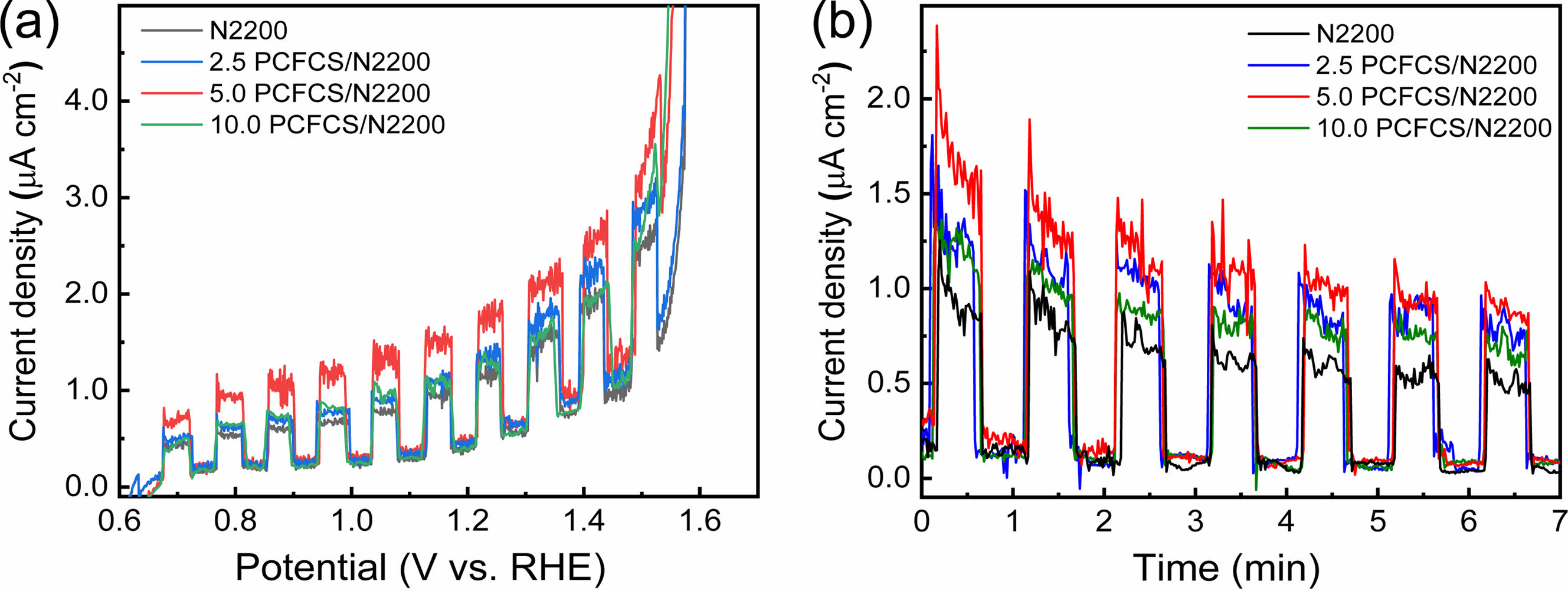 Figure 6 (a) Linear sweep voltammetry of N2200, 2.5 PCFCS/N2200, 5.0 PCFCS/N2200, and 10.0 PCFC/N2200 in 1 M NaOH electrolyte under 1 sun irradiation; (b) chronoamperometry of N2200, 2.5 PCFCS/N2200, 5.0 PCFCS/N2200, and 10.0 PCFCS/N2200 in 1 M NaOH electrolyte at 1.23 VRHE.; For samples of N2200, 2.5 PCFCS/N2200, 5.0 PCFCS/N2200, and 10.0 CFC/N2200 were added by 0 μg, 2.5 μg, 5.0 μg, and 10.0 μg of PCFCS additives to 10 mg/mL N2200 solution, respectively. |