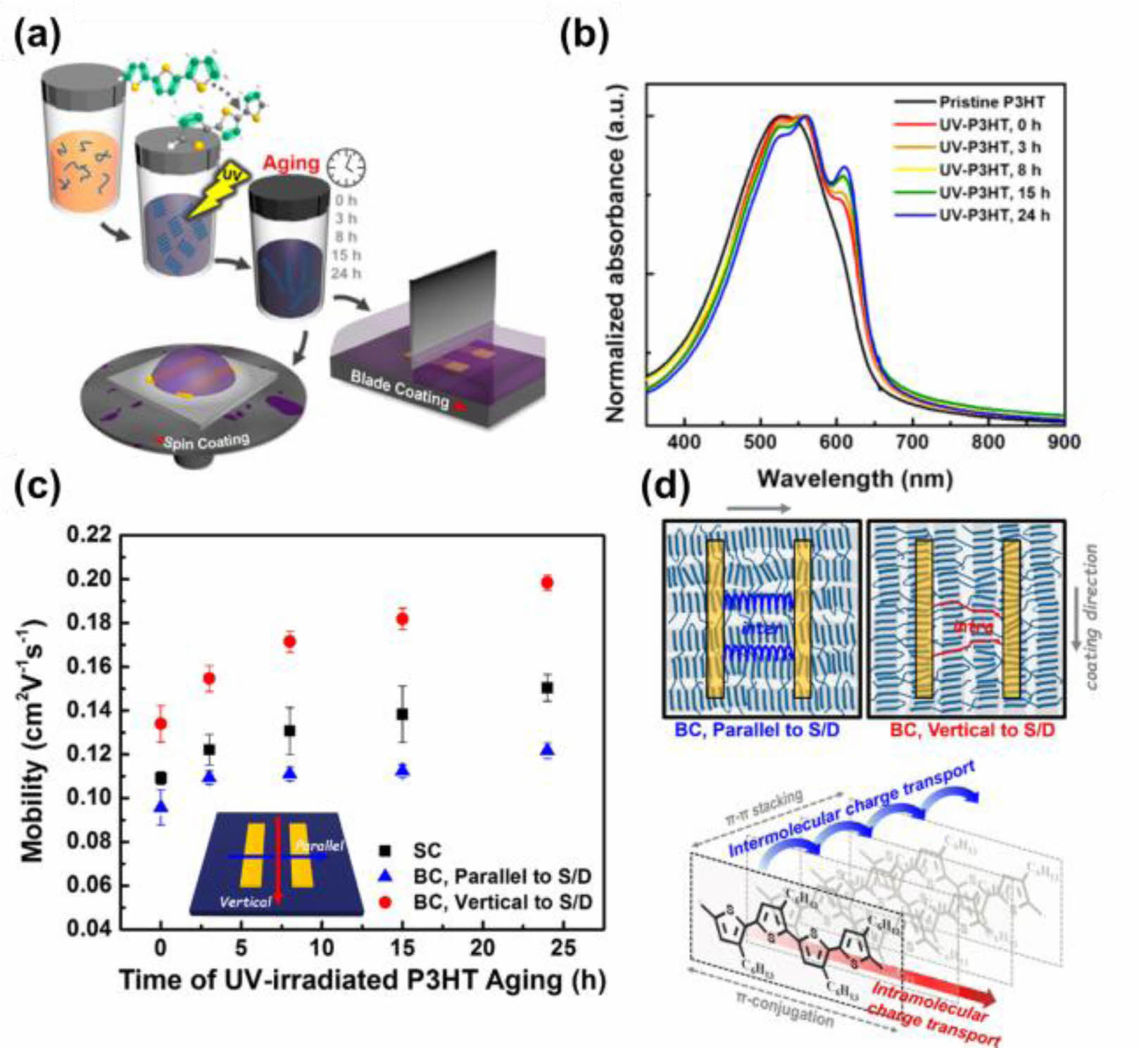 Figure 2 (a) A schematic illustration of the blade-coating; (b) Normalized UV-vis absorption spectra of pristine and aged UV-P3HT thin films; (c) Average mobilities of in parallel and vertical directions; (d) Schematic diagram of blade-coated films. Reproduced with permission from Ref. 11, P. H. Chu et al., ACS Chem. Mater., 2016, 28, 9099-9109.© 2016, American Chemical Society. |