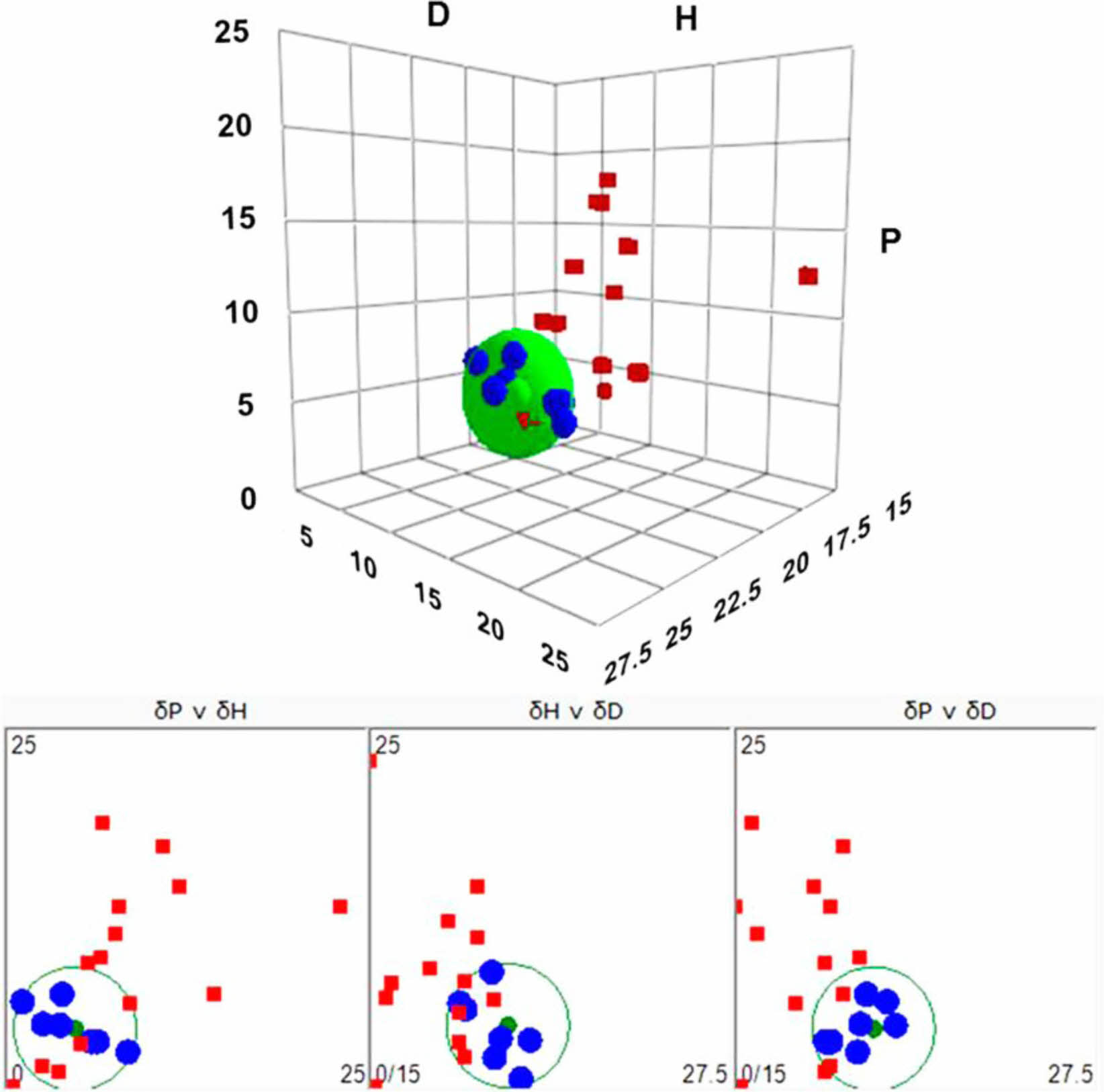 Figure 3 Hansen solubility parameter diagrams for P3HT and selected solvents. Solvents in blue are considered to be good solvents for P3HT while solvents in red are poor solvents. Reproduced with permission from Ref. 36, M. C. Chang et al., ACS Nano, 2013, 7, 5402-5413.© 2013, American Chemical Society. |