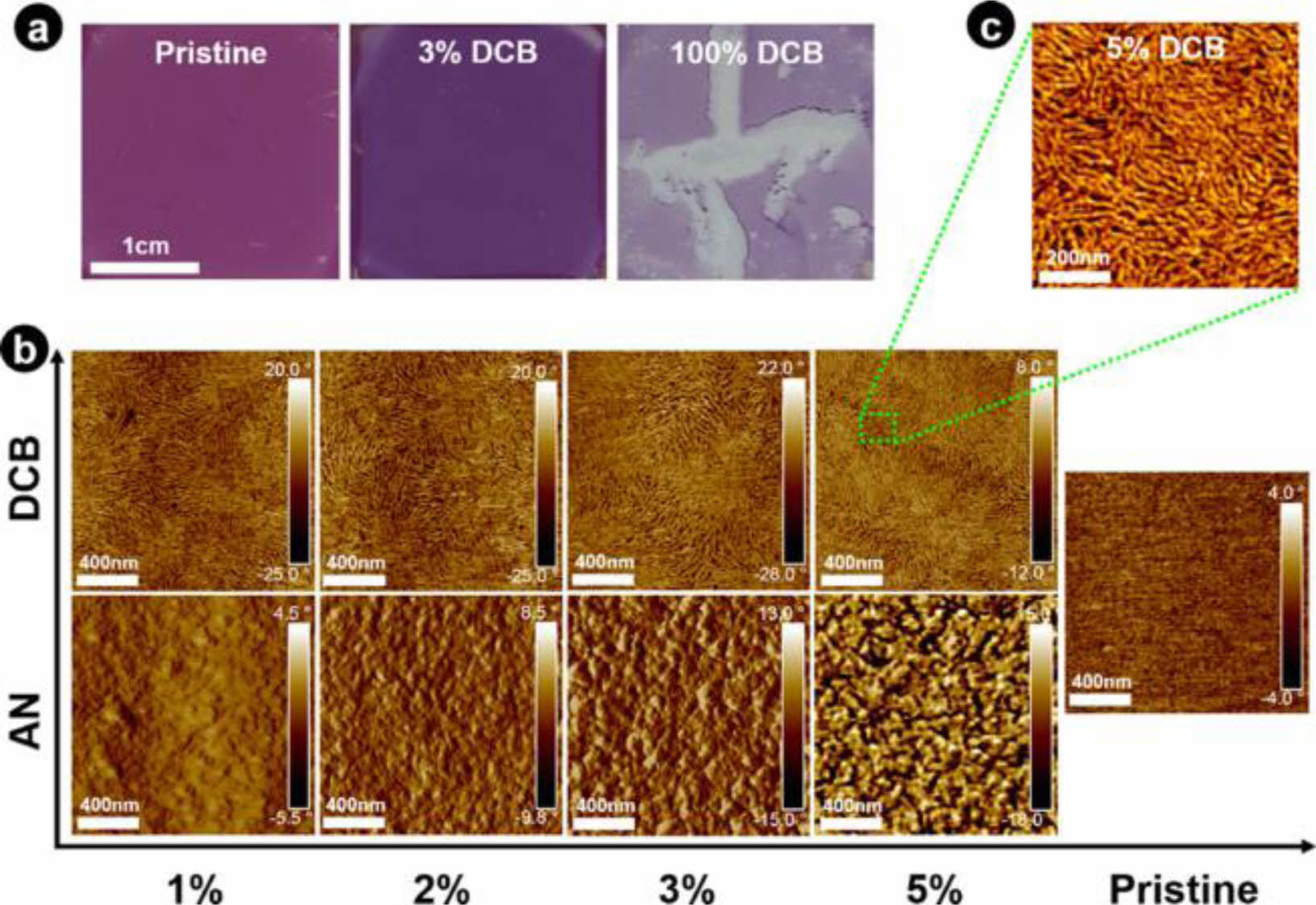 Figure 4 (a) Photographs; (b) AFM phase images of 96% RR P3HT films obtained by spin-coating CF solutions containing different DCB ratios; (c) Magnified AFM image of the 96% RR P3HT film obtained from a CF/DCB-5 vol% solution. Reproduced with permission from Ref. 39, J. W. Jeong et al., ACS Appl. Mater. Interfaces, 2018, 10, 18131-18140.© 2018, American Chemical Society. |
