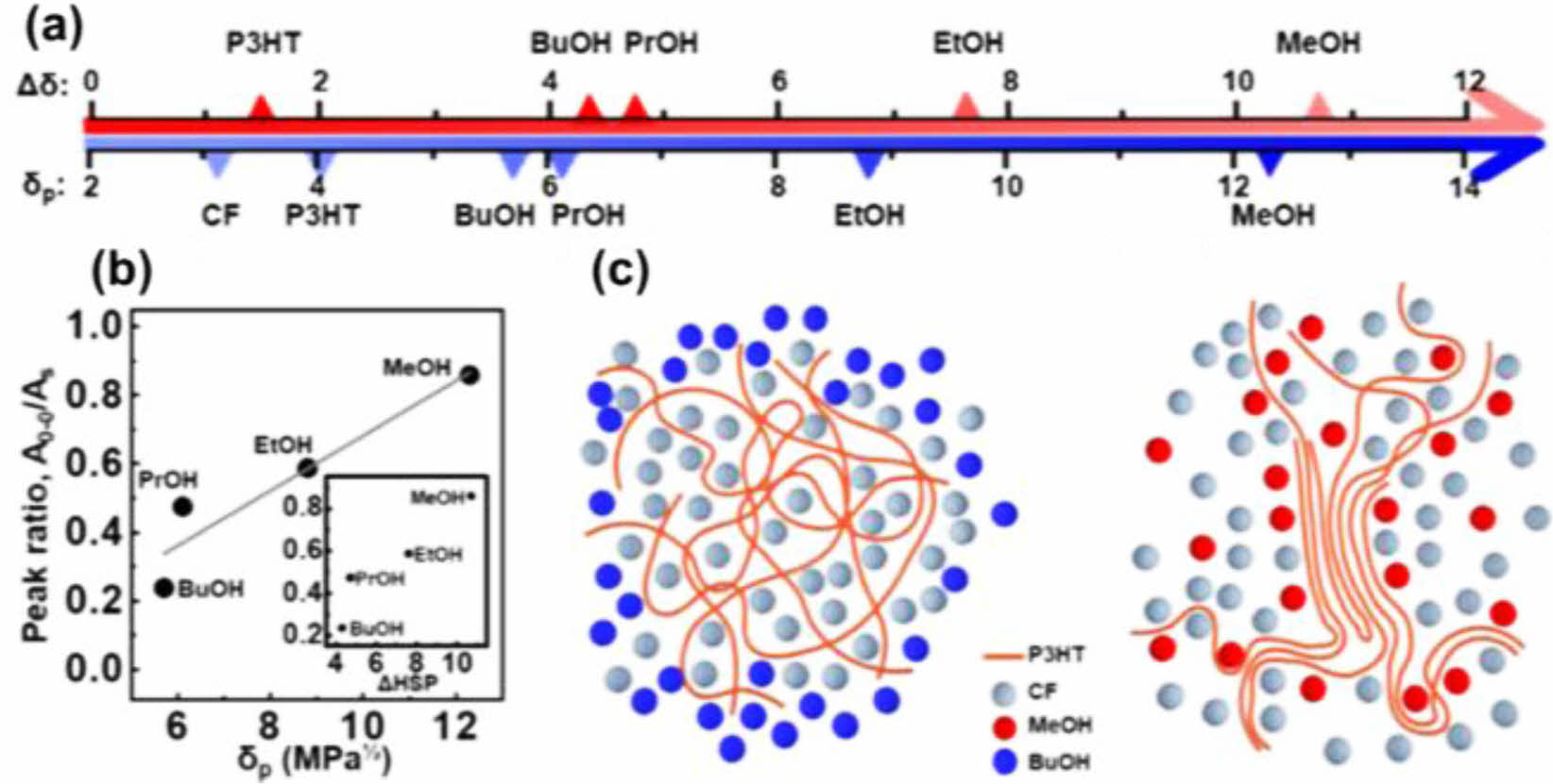 비록 전체 δt 값이 비슷한 값을 가졌더라도 세부적인 항목인 수소결합의 세기 또는 분자간 극성도에 따라 첨가제의 효과가 다르게 나타난다. 앞서 살펴본 바와 같이 용매 첨가제의 효과를 최대화하려면 일반적으로 첨가제와 주용매 사이의 δt 값 차이가 중요하다. 하지만 극성 첨가제를 사용할 시에는 전체적인 δt 값 보다는 δH 또는 δP 항목을 우선적으로 고려해야 한다. CF에 용해된 P3HT 용액에 methyl alcohol(MeOH, δt=29.41), EtOH(δt=26.52), propyl alcohol(PrOH, δt=24.60), butyl alcohol(BuOH, δt=23.20) 4종류의 알코올 비용매를 첨가하여 고분자의 자기조립 현상에 대해 분석하였다.43