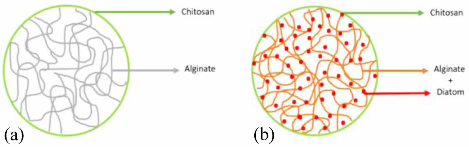 Preparations of Chitosan/Alginate and Chitosan/Alginate/Diatom Beads Scaffolds. Sodium alginate was dissolved in distilled water at a concentration of 5% (w/v) to prepare chitosan/alginate beads scaffolds. Then chitosan was prepared at a concentration of 0.3% in 0.1% acetic acid. The resulting alginate solution was added dropwise to prepared 1 M CaCl2 solution using a Pasteur pipette (3 mL).