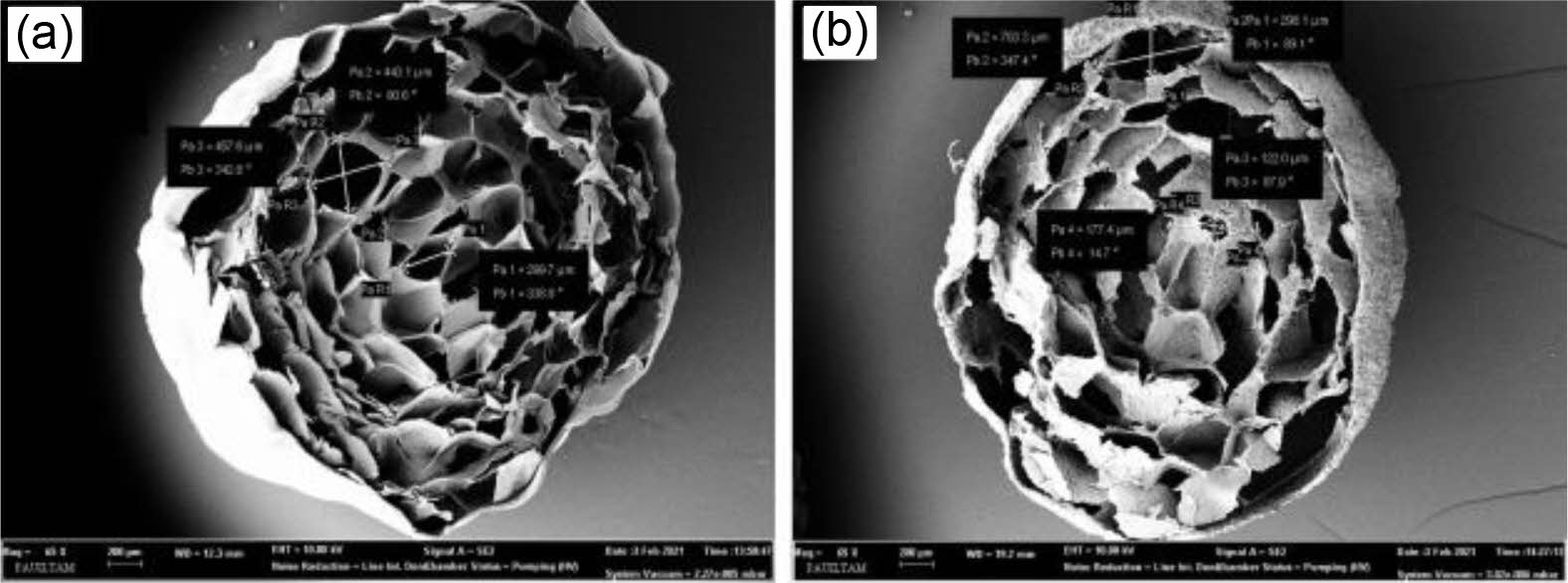 Figure 2 SEM images of (a) AC; (b) ADC (scaffold with the porosity measure). |
