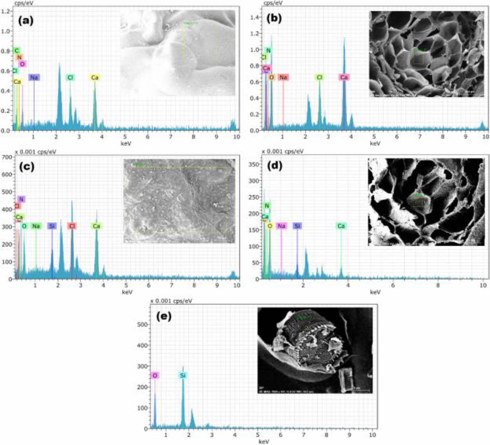 Figure 5 EDS spectrum of the external and internal structure of (a, b) AC; (c, d) ADC scaffold. EDS spectrum of (e) the diatom dispersed in ADC scaffold. |