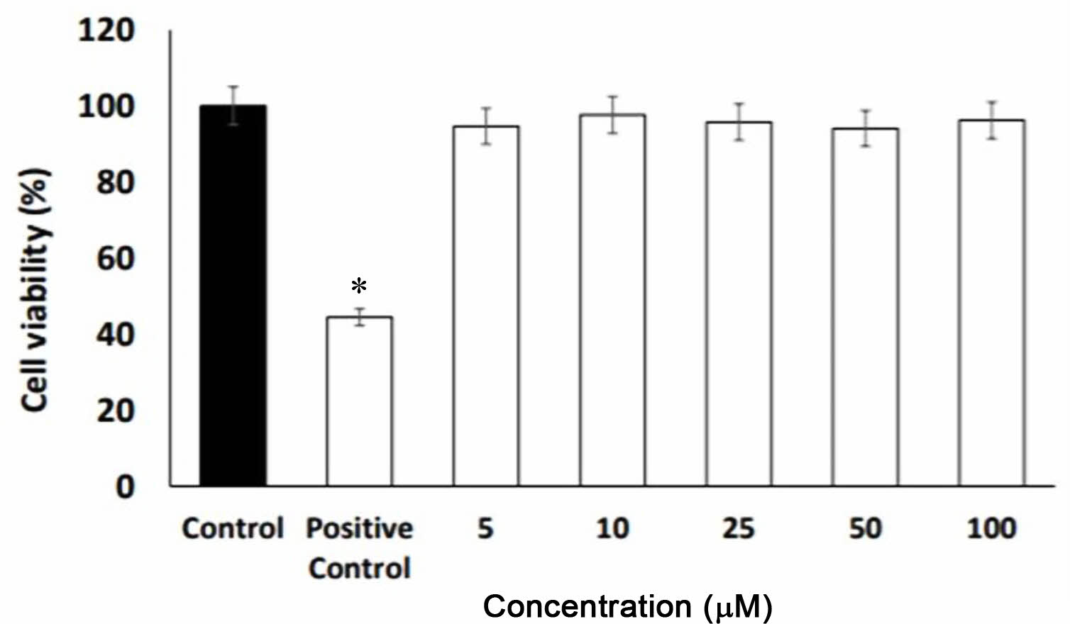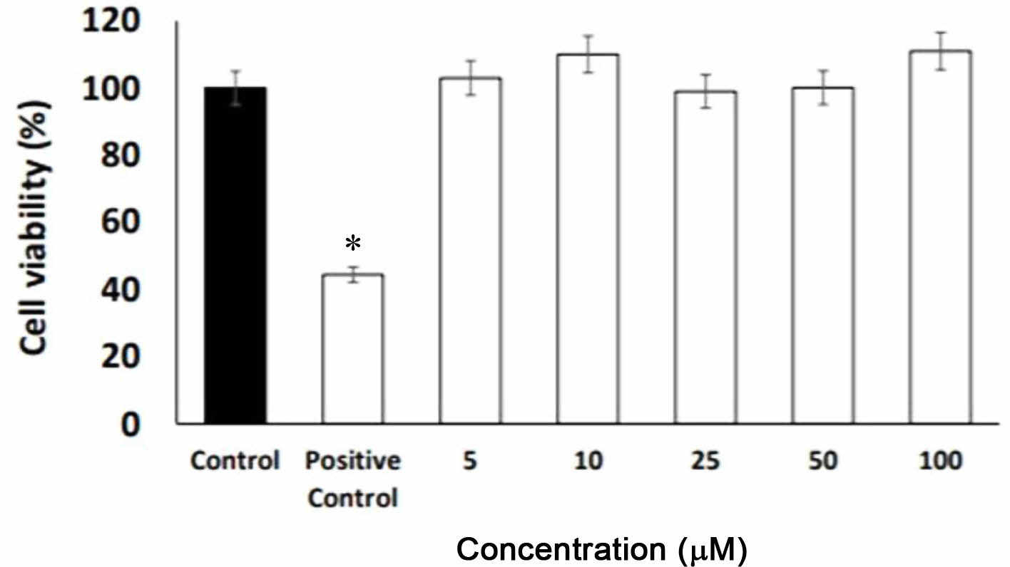 Figure 7 Effect of AC on HEK293 cells viability analyzed by MTT assay. Cells were treated for 24 h with the increased concentration of AC. Positive control: cisplatin (50 µM) (*p<0.05). |