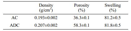 Density, Porosity and Swelling. The density of prepared AC was calculated from the apparent texture density of the ADC scaffold (ρscaffold), dry weight, and the volume of these scaffolds: