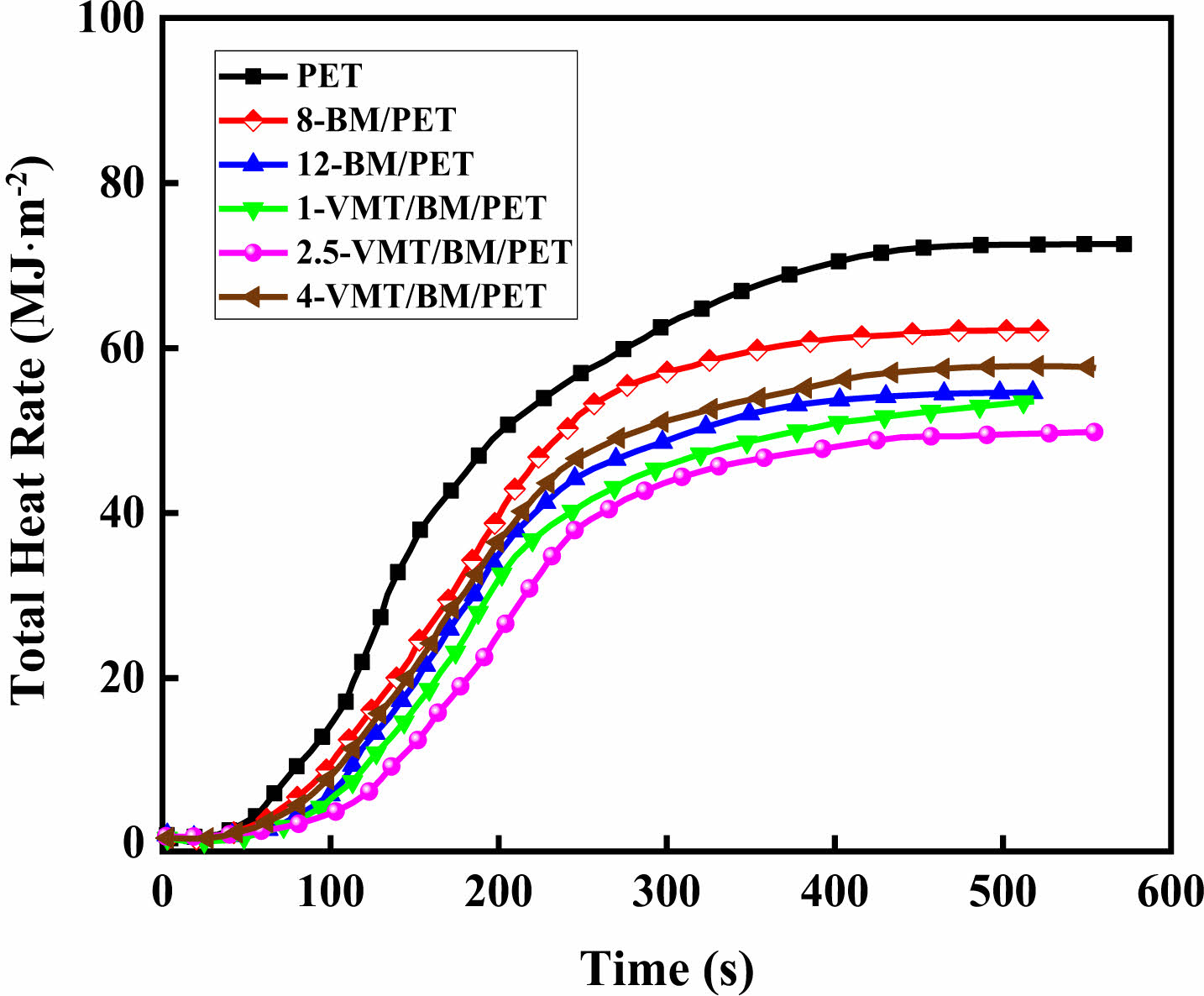 Combustion Behavior of PET, BM/PET, and VMT/BM/PET Composites. The cone calorimeter was usually used to evaluate the flammability characteristics and fire safety of polymer materials in a real fire condition. Heat release rate (HRR) and total heat rate (THR) curves of PET, BM/PET and VMT/BM/PET composites were shown in Figure 2, 3, and the related data were presented in Table 3.