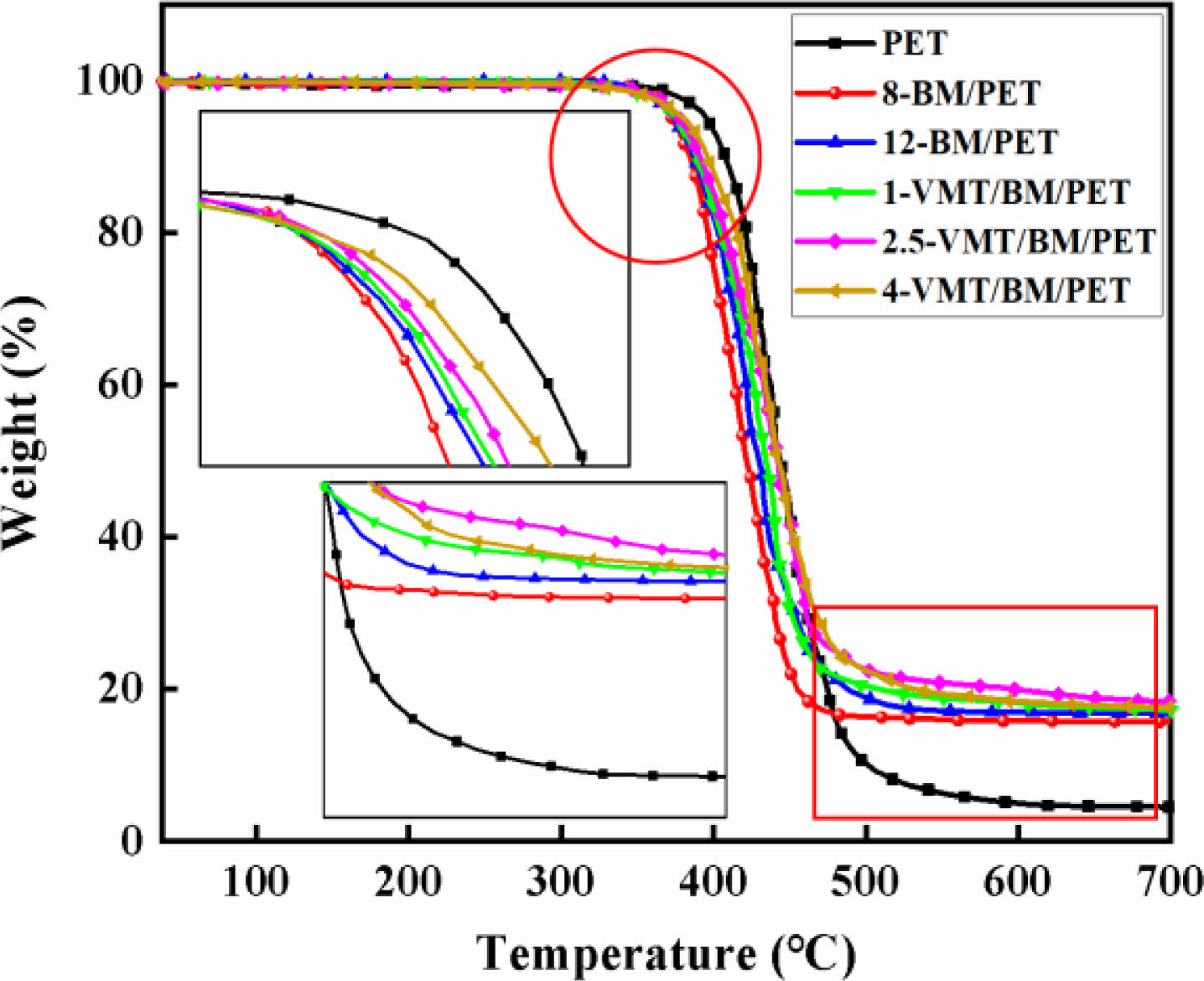 Thermal Degradation Behaviors of PET, BM/PET and VMT/BM/PET Composites. Thermogravimetric analysis (TG) as a useful tool for investigating the mechanism of action for flame-retardance of composites. The thermal degradation curves of PET, BM/PET and VMT/BM/PET composites were shown in Figure 4, and the related data were presented in Table 4.