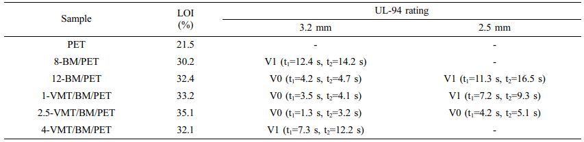 Table 2 LOI Value and UL-94 Rating of PET, BM/PET, and VMT/BM/PET Composites |