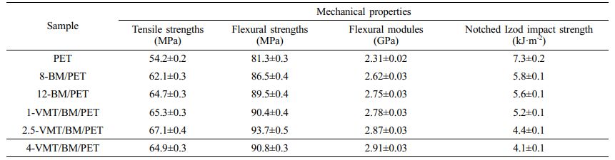 Mechanical Properties of PET, BM/PET and VMT/BM/PET Composites. The mechanical properties of PET, BM/PET and VMT/BM/PET were shown in Table 5. It could be observed that the flexural strengths and tensile strengths of 8-BM/PET and 12-BM/PET increased compare with PET. The result was attributed that the BM was a rigid material with a short rod structure, which could transfer stress from matrix to BM. It also observed that the flexural modules of 12-BM/PET come to 2.75GPa, which was 19.0% more than PET (2.31 GPa), nevertheless, the notched izod impact strength of PET was reduced when added BM. Such result was because the BM restricted motion of polymer chains, decreased the deformation capacity of the matrix in the elastic zone and reduced the ductility of composites, therefore, the BM/PET become brittler and stiffer.