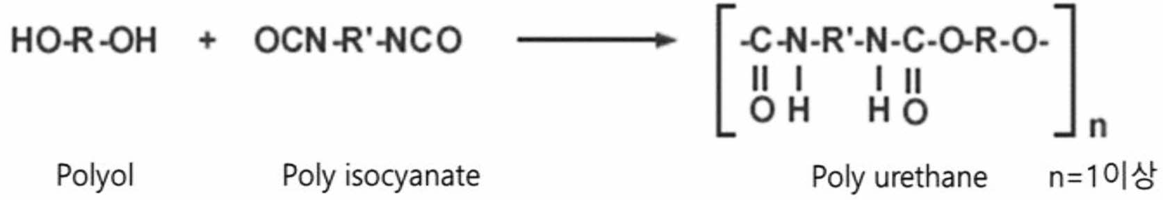 열가소성 수지의 사출성형품은 자동차, 가전, 디스플레이 등 매우 다양한 분야에 광범위하게 사용되고 있다. 그러나 많은 성형품에서 외관 품질, 광택, 내스크래치성, 내열성, 내구성 등을 향상시키기 위하여 별도의 후 공정이 이루어지고 있다. 일반적으로 사용되고 있는 후 공정 중 도금, 도장, 증착, 인쇄 등과 같은 표면처리 기술들은 생산 단가 및 리드 타임을 상승시키고 휘발성 유기 용제 사용에 의한 환경오염, 제조비용 상승 등 다양한 문제를 유발시키고 있다.1,2 이러한 문제들을 해결하기 위하여 최근에 도입된 인몰드 코팅 시스템(in-mold coating, IMC)은 열가소성 수지를 용융시켜 제품을 사출성형 한 후, 기재를 금형 외부로 취출하기 전, 금형 내에서 금형 면과 제품 사이로 액체 상태의 열경화성수지를 주입후 경화시켜 코팅하는 혁신적인 새로운 기술이다.3-5 최근 유럽의 선진기업에서 상용화되고 있는 신 공법으로 아직까지 국내에서 적용된 사례가 없을뿐더러 관련된 많은 연구가 이루어지고 있지 않다. 특히, 코팅의 최종 품질을 좌우할 수 있는 인몰드 코팅용 열경화성 폴리우레탄 수지의 물성 설계에 관한 기초 연구가 적다는 문제점이 있다. 이러한 열경화형 폴리우레탄은 활성수산기(-OH)를 갖고 있는 주제인 폴리올(polyol)과 이소시아네이트(isocyanate)기(-NCO)를 포함하고 있는 경화제인 폴리이소시아네이트(polyisocyanate) 화합물의 가교반응(addition polymerization reaction)에 의하여 생성된다. Figure 1은 폴리우레탄의 가교반응을 나타내었다.6