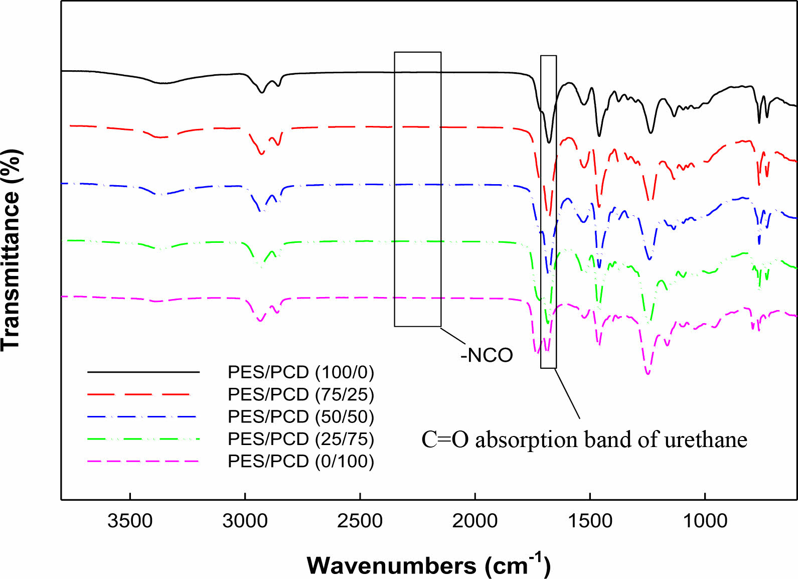 Figure 5 FTIR spectra of PES/PCD blends-based polyurethane. |