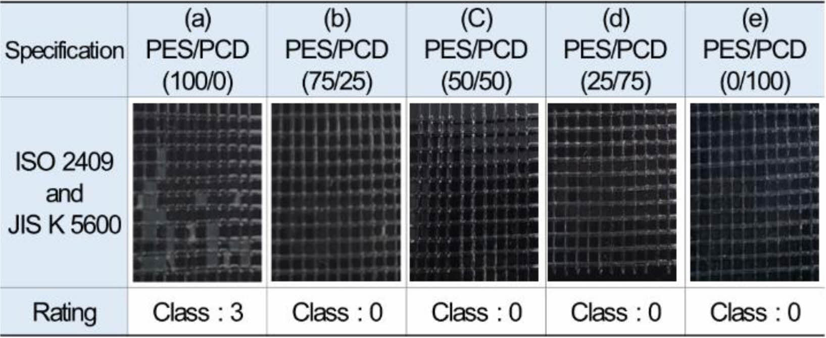 부착성능. Figure 6은 수지 혼합비율 별 ABS(XR-401, LG화학) 소재에 대한 부착성능을 나타내었다. PES(XP 2488) 단독의 경우(a), Class 3으로 15% 이상 도막이 박리되어지는 결과를 확인할 수 있었으며, (b-e)의 PCD(C 1100) 25 wt% 이상 포함되었을 경우 Class 0으로 양호한 결과를 확인할 수 있었다. 이는 PCD(C 1100)가 ABS 소재 부착력에서 PES(XP 2488) 보다 우수하며, 부착력이 우수한 PCD의 함량이 증가되었기 때문이다.