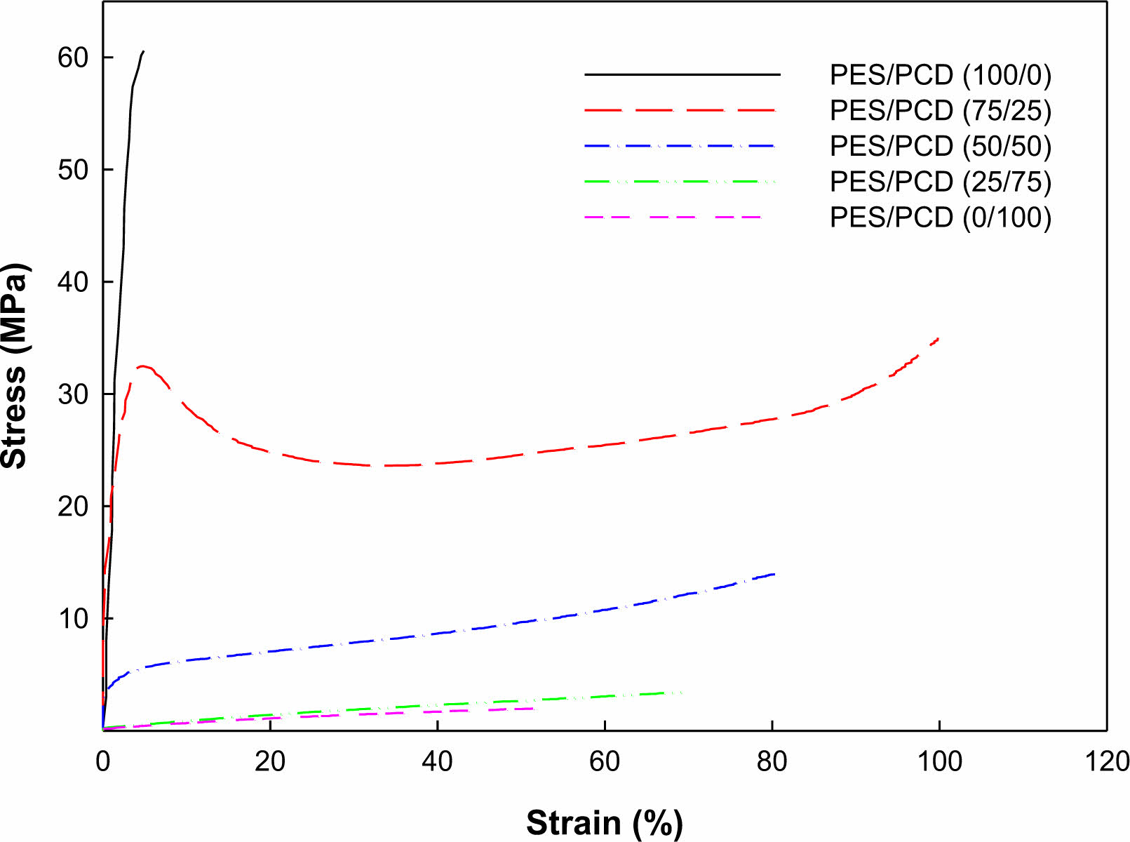 Figure 7 Stress-strain curves of PU network PES/ PCD blends. |