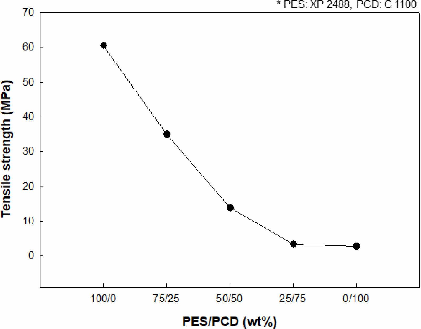 Figure 8 Tensile strength of PU network PES/PCD blends. |