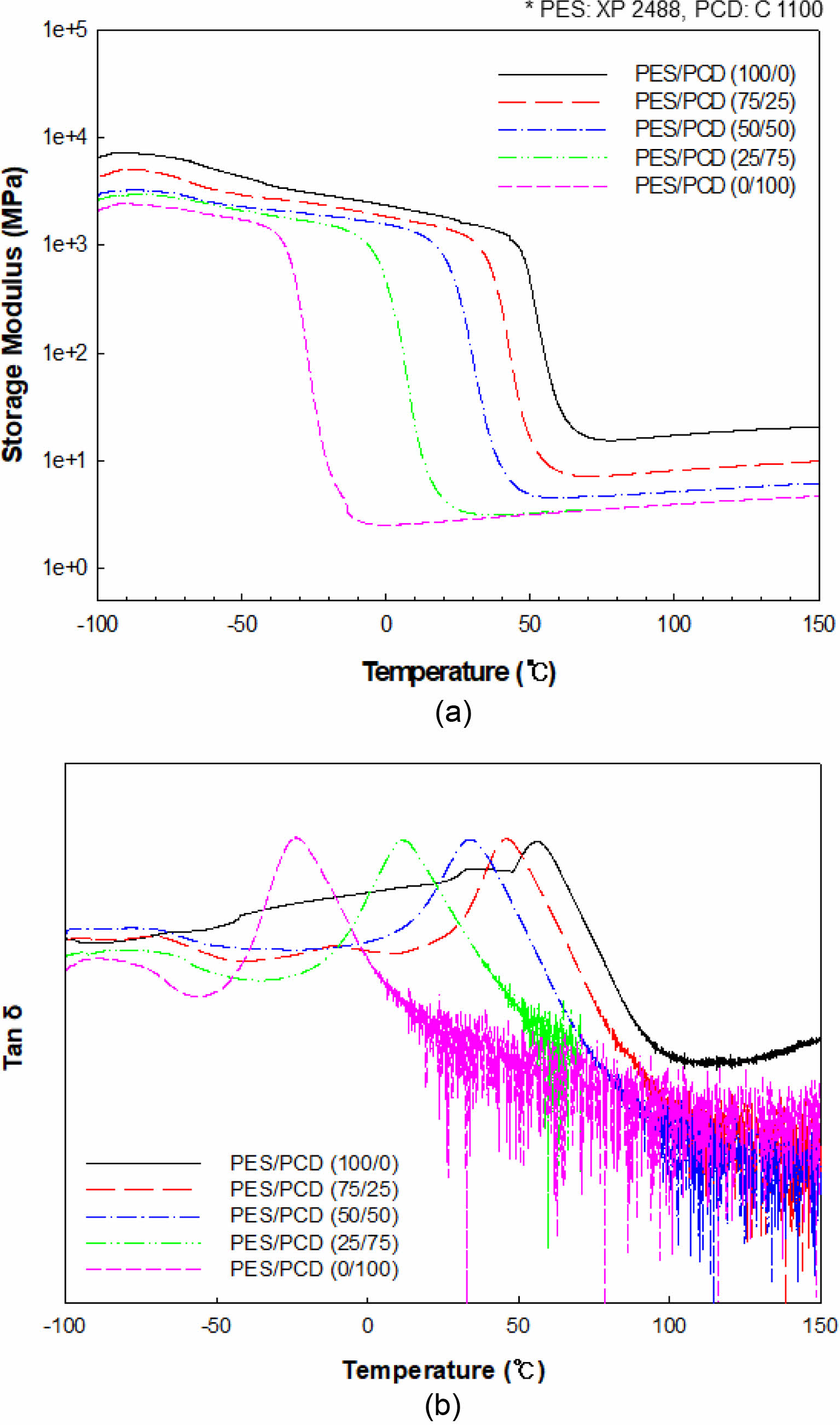 Figure 9 (a) Dynamic storage modulus and (b) Tan δ of PES/PCD blends based PU network. |