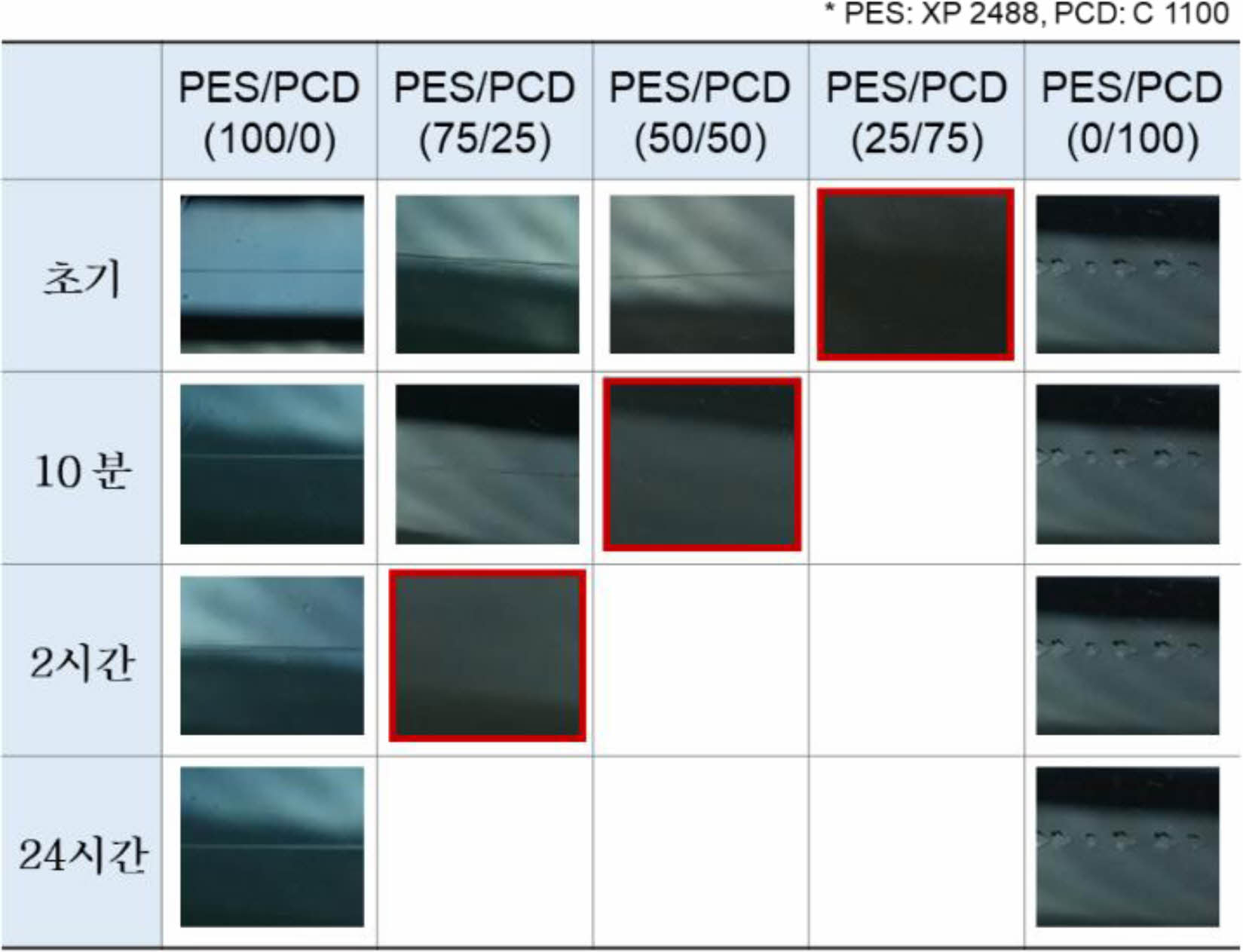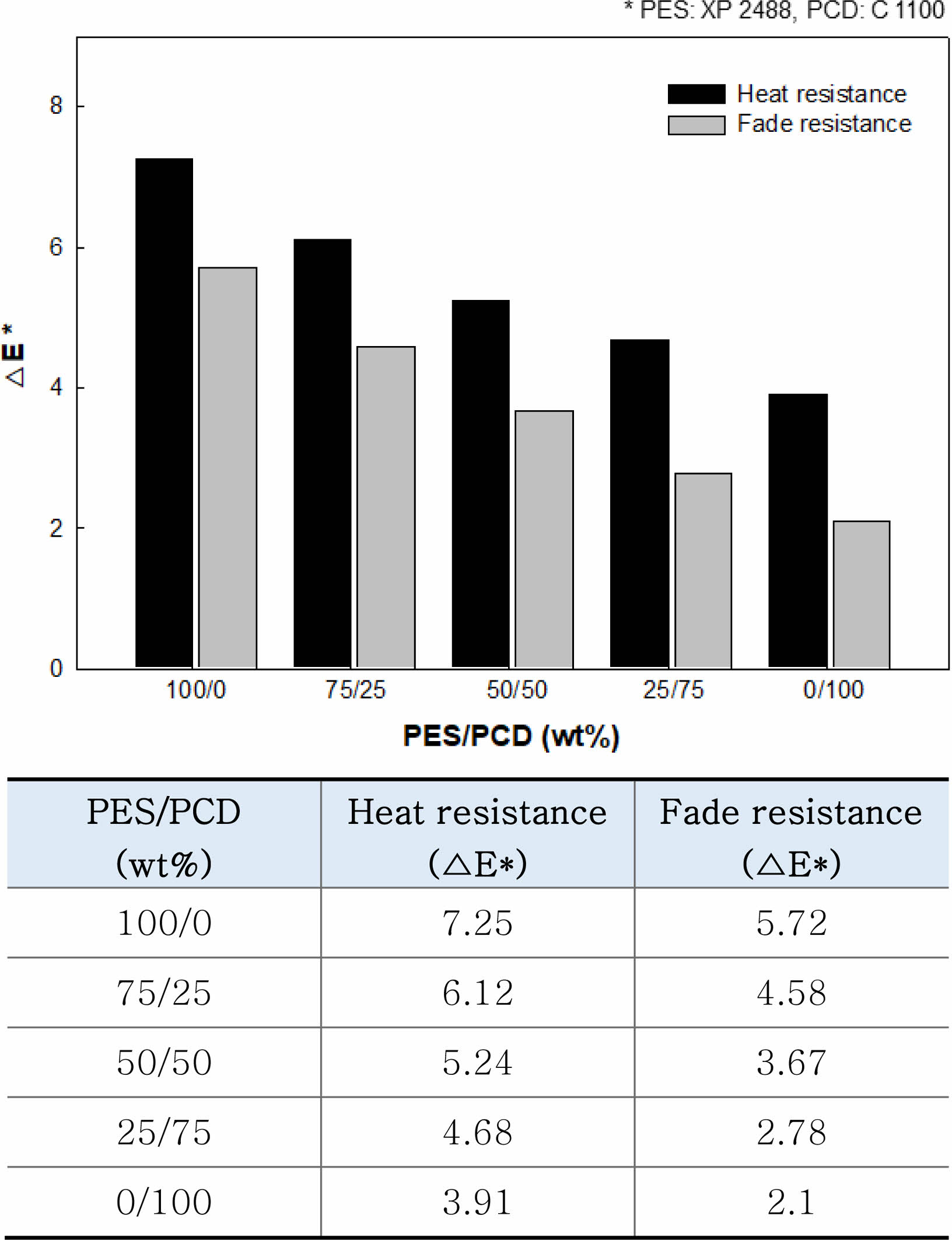 내구 성능. Figure 11은 내열 및 내광 성능에 대한 색차 측정결과이다. PES(XP 2488)의 함량이 증가되고, PCD(C 1100)의 함량이 감소될수록 내열 및 내광 성능이후의 변색 정도가 심한 것으로 관찰되었다. 이는 PCD(C 1100)의 내구 성능이 PES(XP 2488)보다 우수하기 때문인 것으로 확인된다.